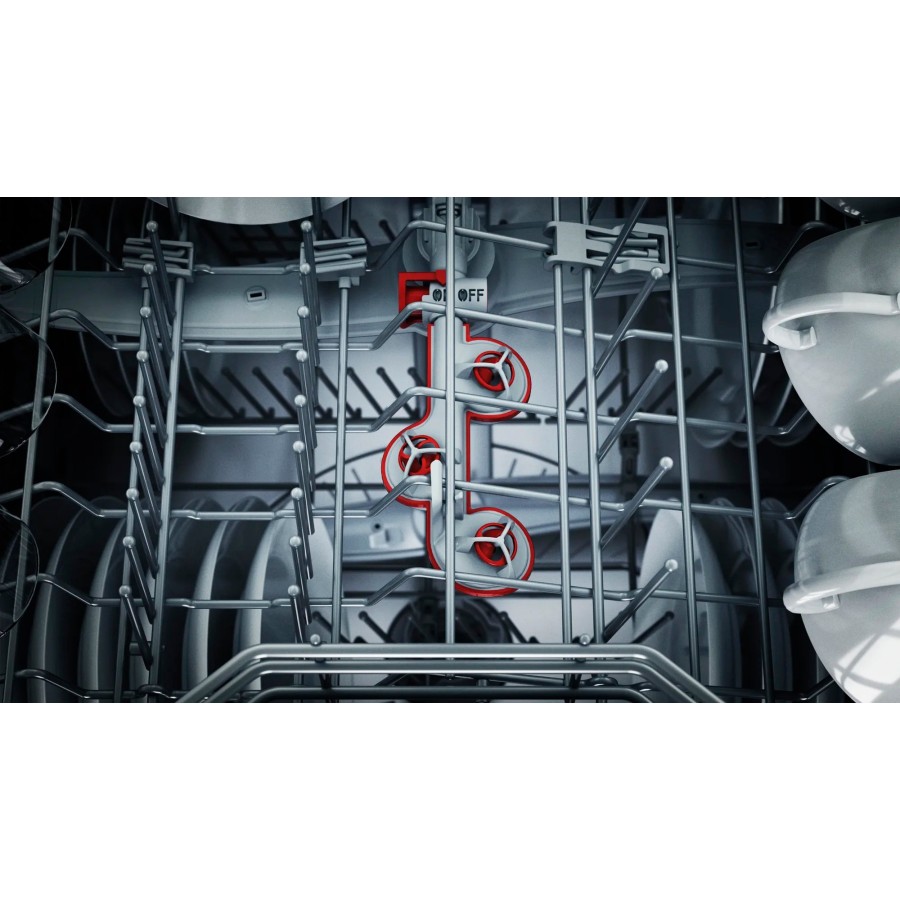 Місткий верхній короб можна регулювати по висоті в цілому на 5 см між трьома положеннями простим рухом руки завдяки системі Rackmatic. Тарілки для піци або фужери на високій ніжці – ця система дозволяє дуже гнучко створити додаткове місце для високих предметів посуду у верхньому чи нижньому коробі.