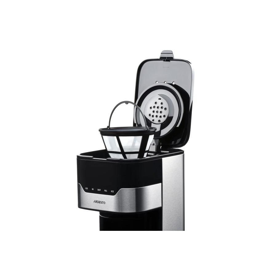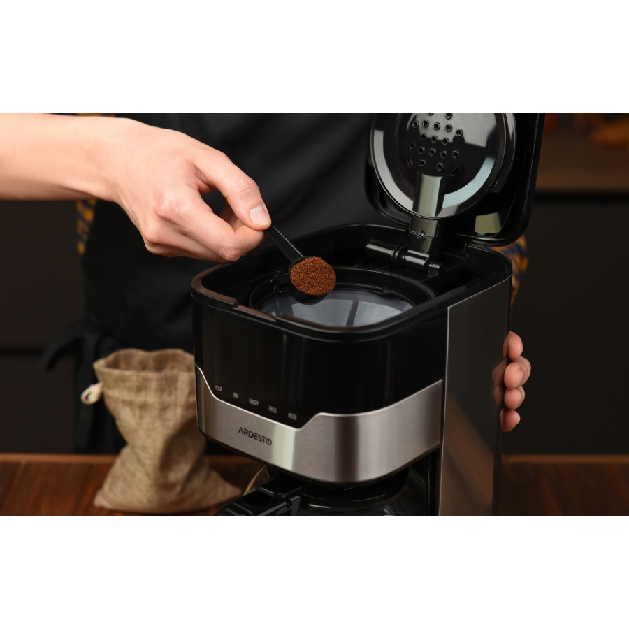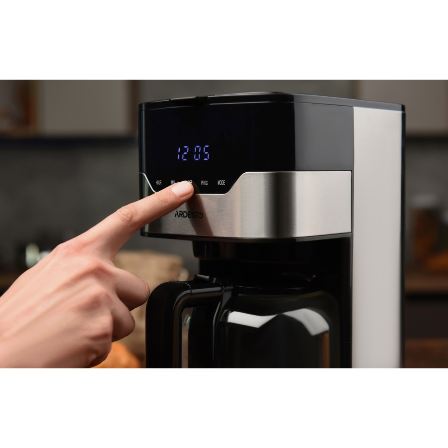 Кавоварка оснащена зручною сенсорною панеллю управління з вбудованим дисплеєм, годинником, таймером приготування та підтримує вибір міцності напою. Автовідключення кавоварки відбувається через 2 години після приготування.