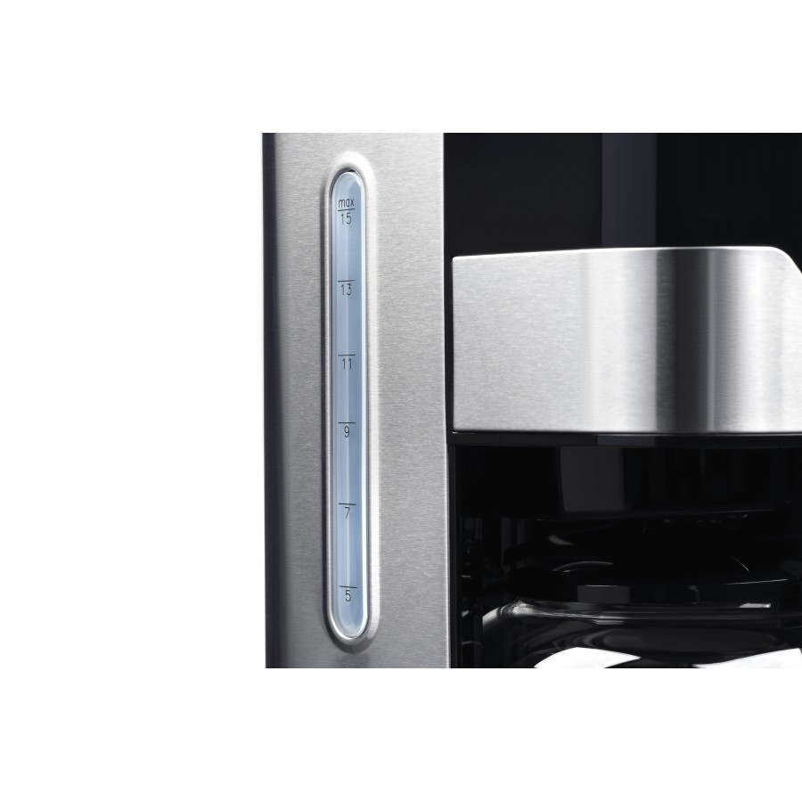 Корпус кавоварки виконаний з міцного глянсового чорного пластика та вставок з шліфованої нержавіючої сталі. На лицьовій панелі розташований сенсорний блок управління. Дисплей отримав підсвічування синього кольору. Внутрішній резервуар для води з індикатором розрахований на 1,5 л. Прозорий кавник також вміщує 1,5 л і виконаний з боросилікатного скла. Для підтримки температури напою після приготування, в ніші для кавника, розташований нагрівальний диск з антипригарним покриттям.