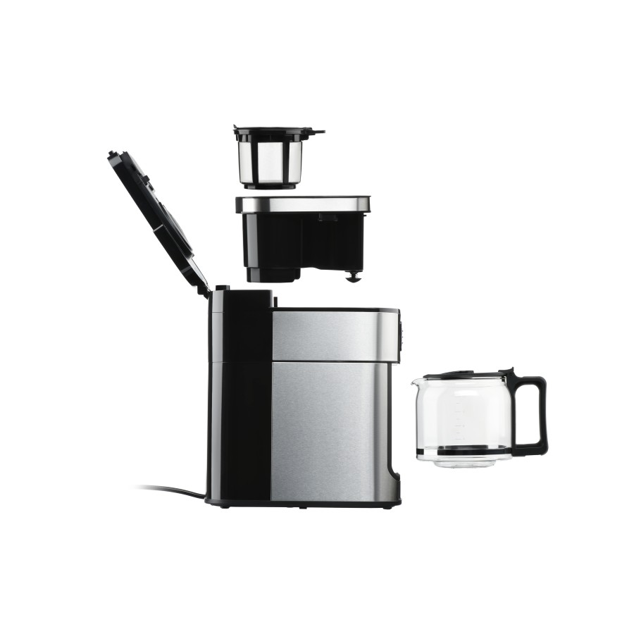 Контейнер для зерен та меленої кави поєднаний з фільтром і кавомолкою, яка розрахована на 60 г зерен. Знімні деталі забезпечують легку та швидку очистку кавоварки після використання.