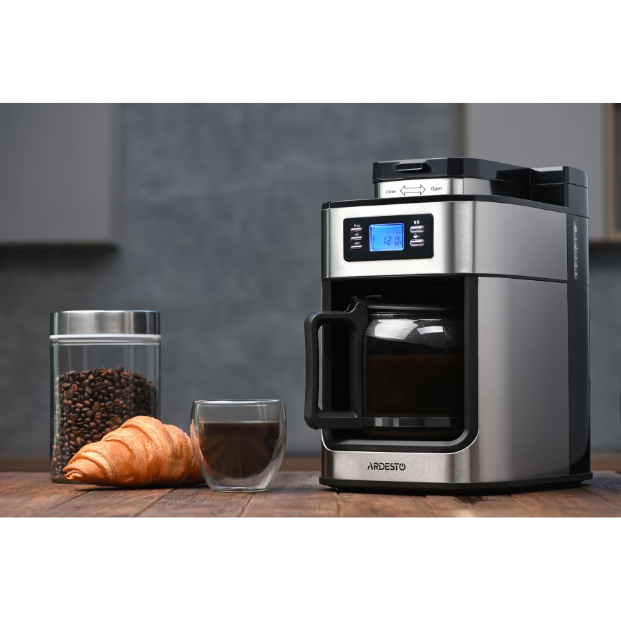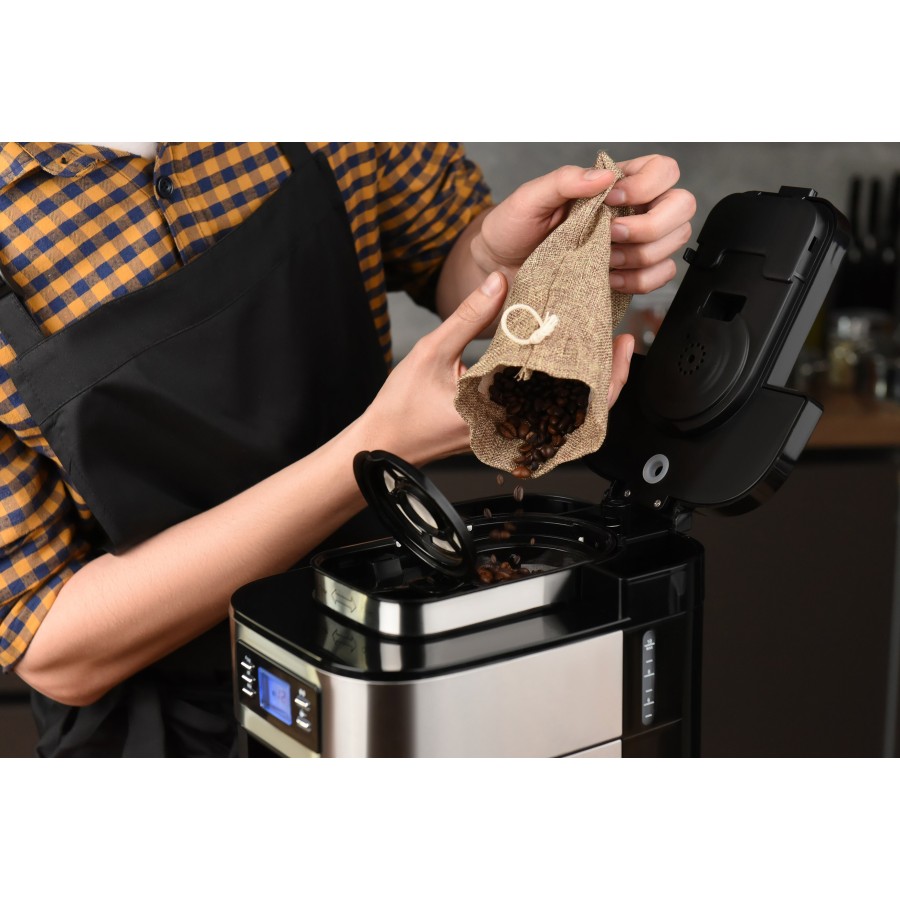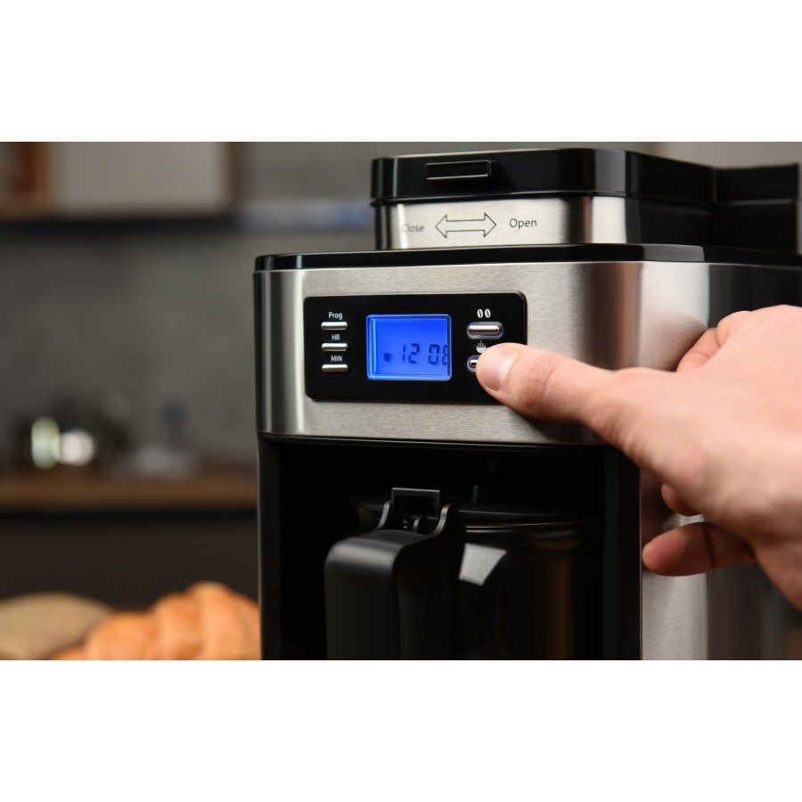 Кавоварка оснащена зручною панеллю керування з вбудованим дисплеєм, годинником і таймером приготування. Система підігріву кавника активна 30 хвилин. Автовідключення кавоварки відбувається через 40 хвилин після приготування.