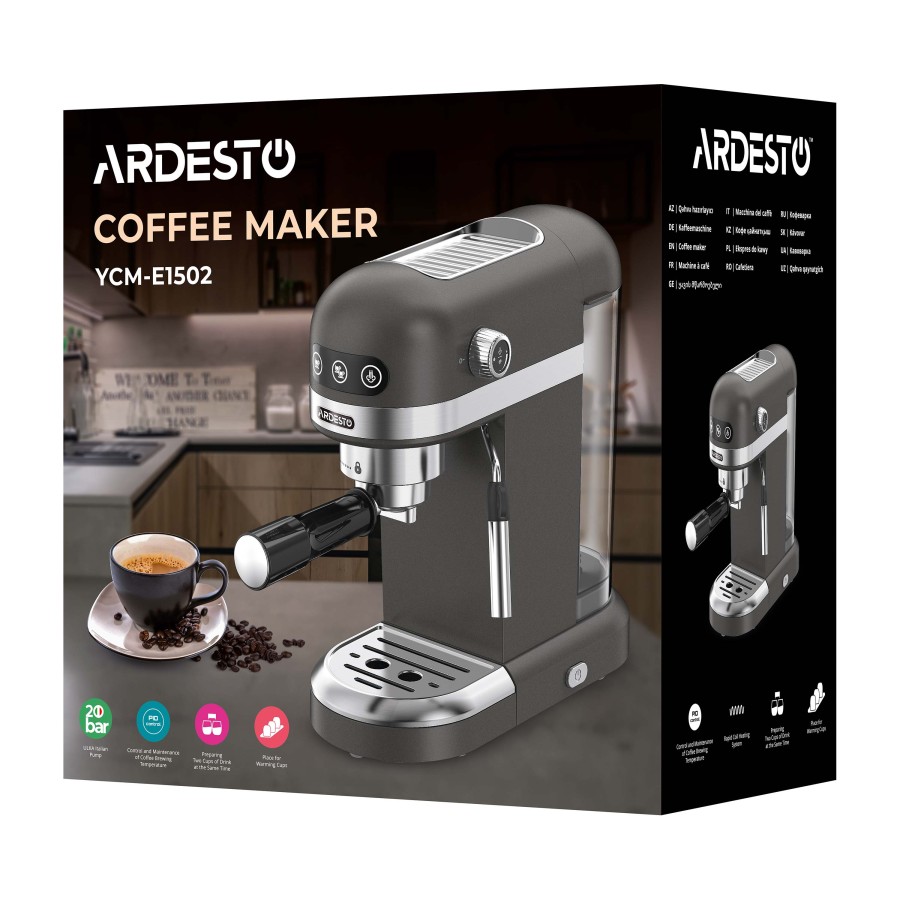 YCM-E1502 дуже зручна в керуванні. Це обумовлено наявністю панелі сенсорного керування й PID-контролера – цифрового термостата – вельми шанованого кавоманами. Він забезпечує термостабільність під час проливу кави, що безпосередньо впливає на смак напою. Температура заварювання становить 92 °С. Аби зварити смачне еспресо, просто наповніть ріжок і встановіть його, виберіть параметри, а про якість приготування подбає кавоварка YCM-E1502.