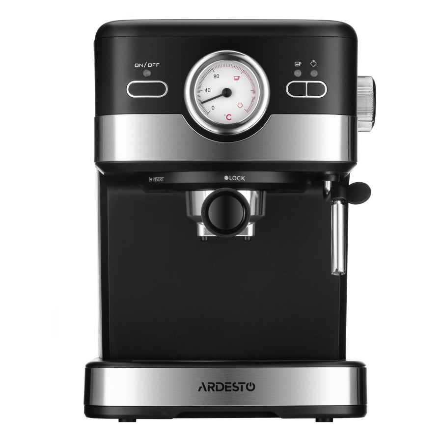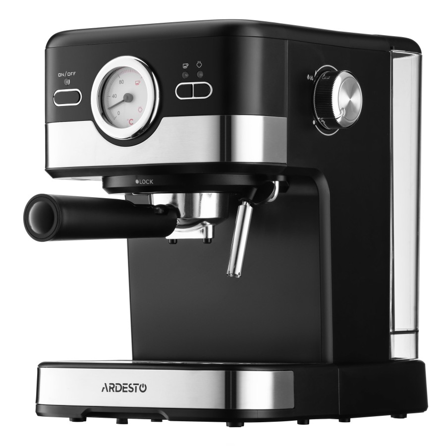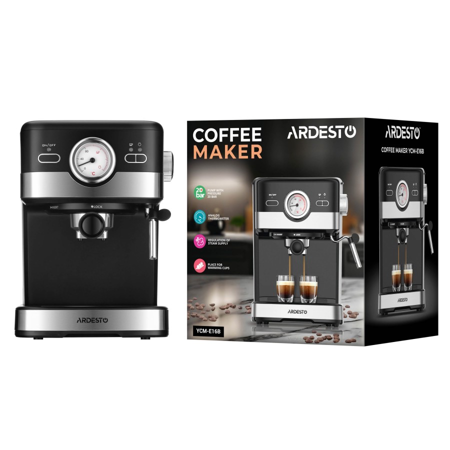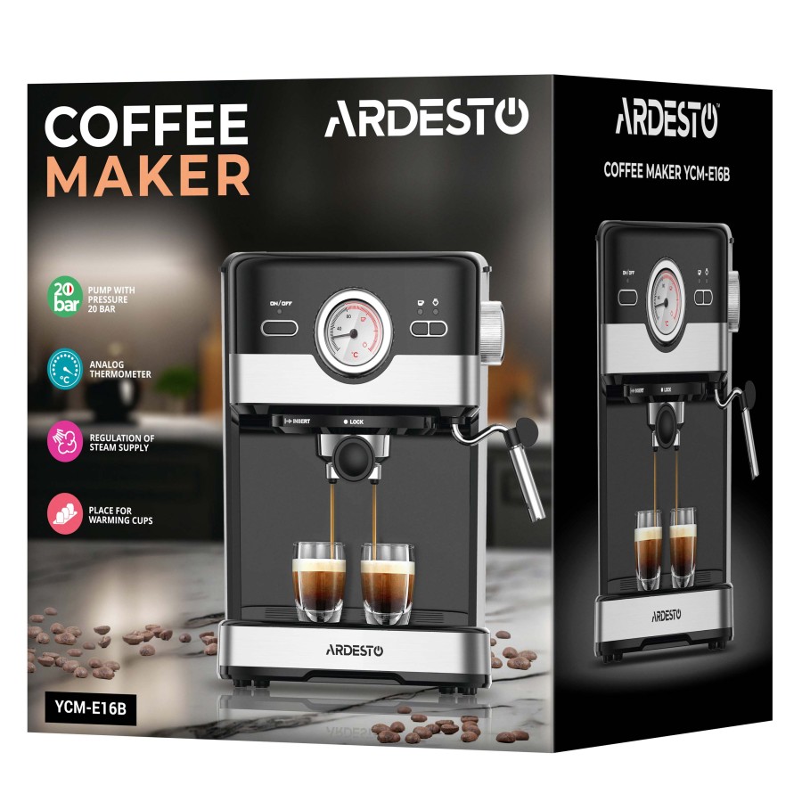 Ріжкова кавоварка ARDESTO YCM-E16B швидко приготує ароматне еспресо, а також молочні напої на його основі, як-от лате або капучино. Має помпу тиском у 20 бар, аналоговий термометр для зручного контроля нагріву води, індикатори готовності до приготування кави або молочної піни, знімну насадку капучинатора та знімний піддон для крапель для легкого очищення. Є регулювання подавання пари, поверхня для підігріву чашок та функція автоматичного вимкнення, а також можливість приготування двох чашок напою одночасно.