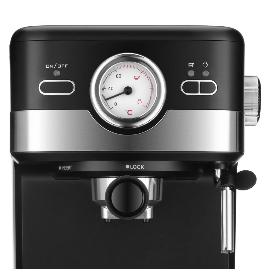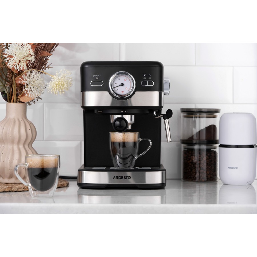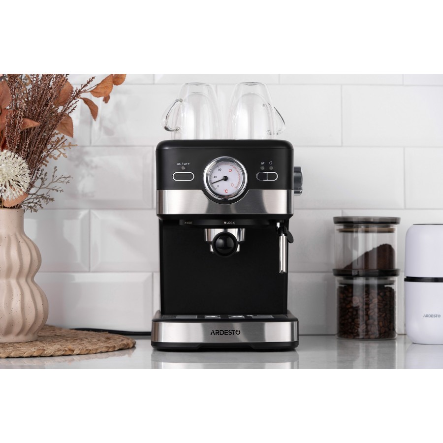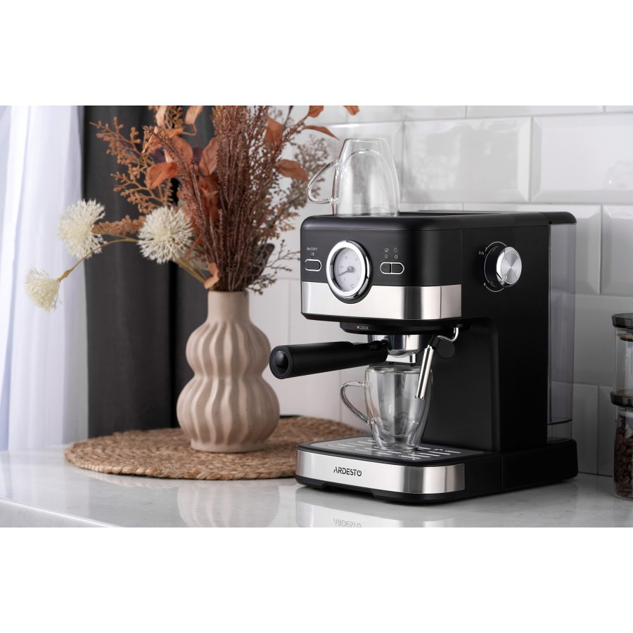 Ріжкова кавоварка ARDESTO YCM-E16B швидко приготує ароматне еспресо, а також молочні напої на його основі, як-от лате або капучино. Має помпу тиском у 20 бар, аналоговий термометр для зручного контроля нагріву води, індикатори готовності до приготування кави або молочної піни, знімну насадку капучинатора та знімний піддон для крапель для легкого очищення. Є регулювання подавання пари, поверхня для підігріву чашок та функція автоматичного вимкнення, а також можливість приготування двох чашок напою одночасно.