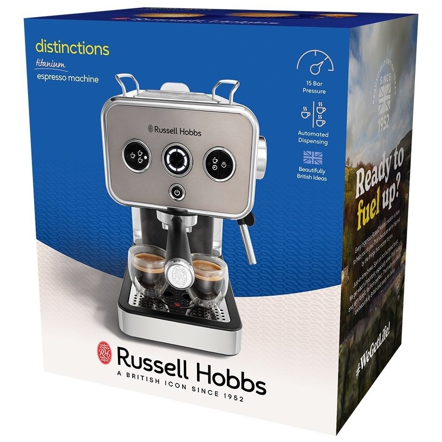 Почніть свій день з однієї або двох порцій еспресо в чашці кави. Цей культовий напій із кофеїном є ідеальним дзвіночком для пробудження, і, виходячи з еспресо-машини Russell Hobbs Distinctions, подумаєте, що його приготував професійний барист.