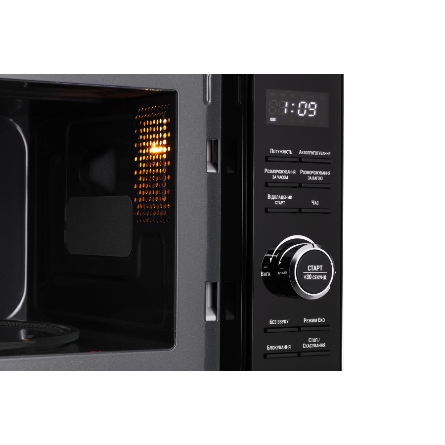 І корпус, і скло на дверцятах мікрохвильової печі виконані в чорному кольорі – трендовий дизайн повсякчас. Праворуч від дверцят, що мають бічне відкриття, вбудовано дисплей, кнопки програм і поворотний перемикач. 700 Вт потужності розподілено на 5 рівнів (20 %, 40 %, 60 %, 80 %, 100 %), тож можна вибирати необхідний відповідно до потреб. Споживана потужність: 1 200 Вт (мікрохвилі). Зсередини внутрішню камеру об’ємом 20 літрів вкрито емаллю. Піч оснащено системою поворотного столу, тож у комплекті постачання міститься: сам скляний стіл (⌀ 24,5 см), опора до нього, вісь обертання й, на додачу, інструкція з експлуатації з гарантійним талоном.