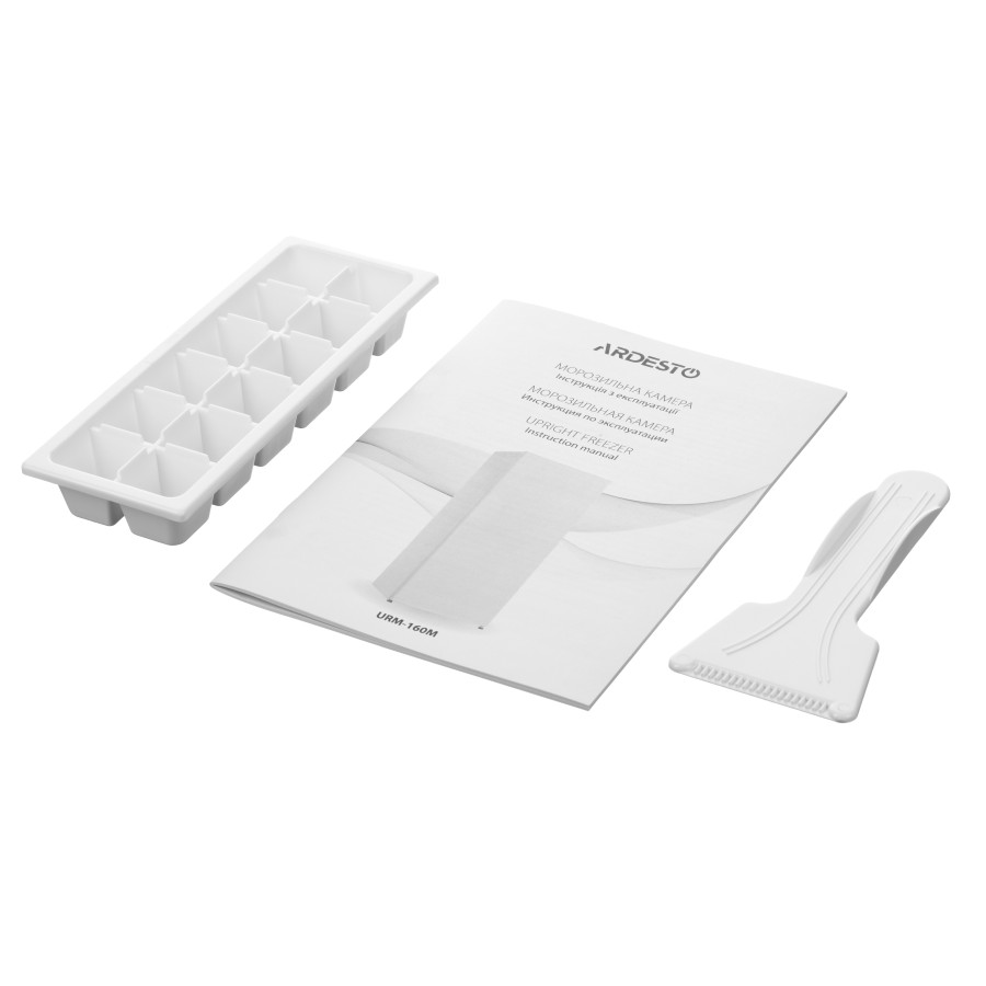 Зручне транспортування по рівній поверхні забезпечують коліщатка, а для надійної установки передбачені ніжки з функцією регулювання висоти. У комплектацію входить форма для льоду та скребок для очищення