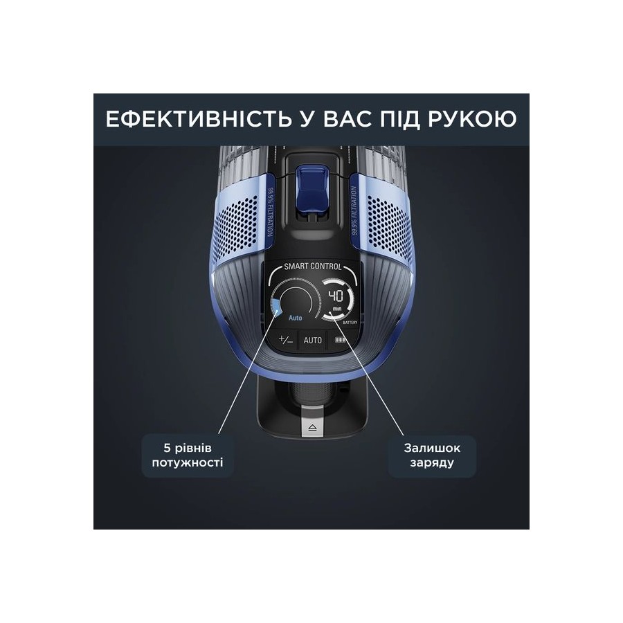 Дисплей Smart Control показує залишок заряду батареї та сповіщує про необхідність очищення фільтра, а також дозволяє регулювати потужність відповідно до ваших потреб за допомогою 4 різних рівнів і і тригера Boost.