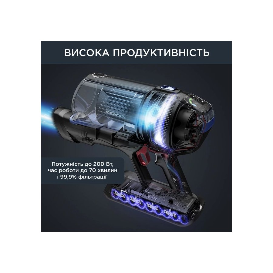 Бездротове прибирання: потужне всмоктування до 200 повітряних Ват, довговічна батарея з часом роботи до 70 хвилин і 99,9% фільтрації дрібного пилу, алергенів і пилових кліщів.