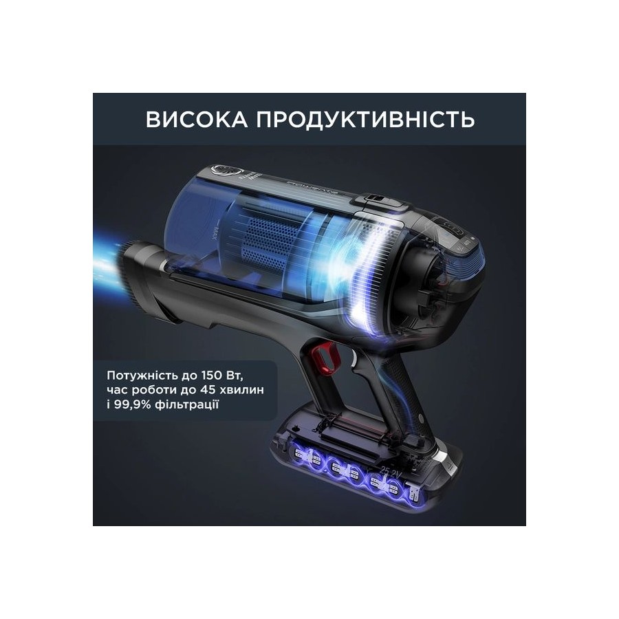 Бездротове прибирання: потужне всмоктування до 150 Вт*, довговічна батарея з часом роботи до 45 хвилин** і 99,9% фільтрації дрібного пилу, алергенів і пилових кліщів.
