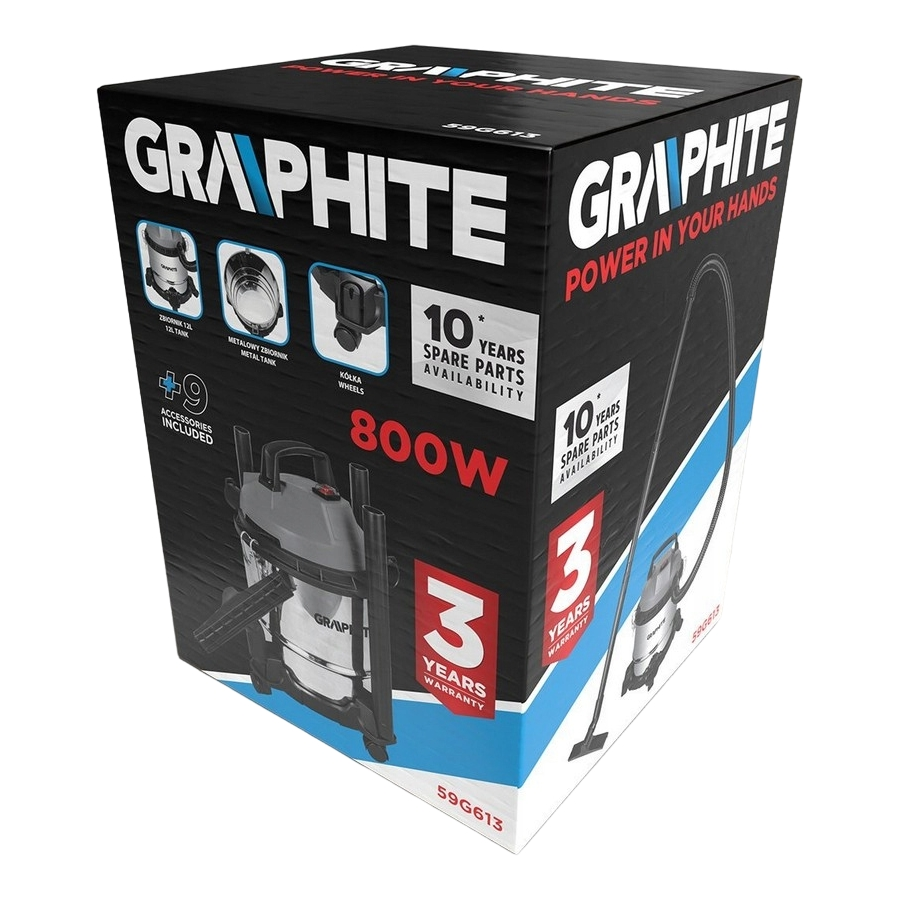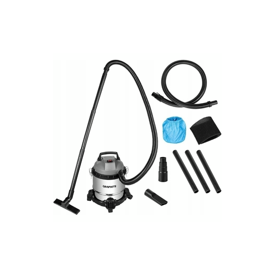 Промисловий пілосос GRAPHITE має тканинний та поролоновий фільтр. Функція видування забезпечує розширені можливості пристрою. У комплект також входити щілинна насадка, три підовжувальні трубки, щіточка та редукційний наконечник. Має клас захисту пристрою II класу. Ідеально підходить як для домашнього використання, так і для майстерні.