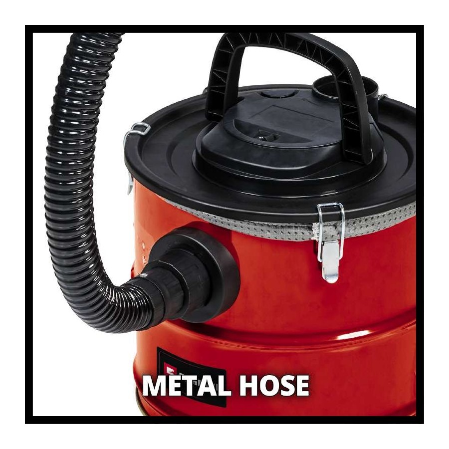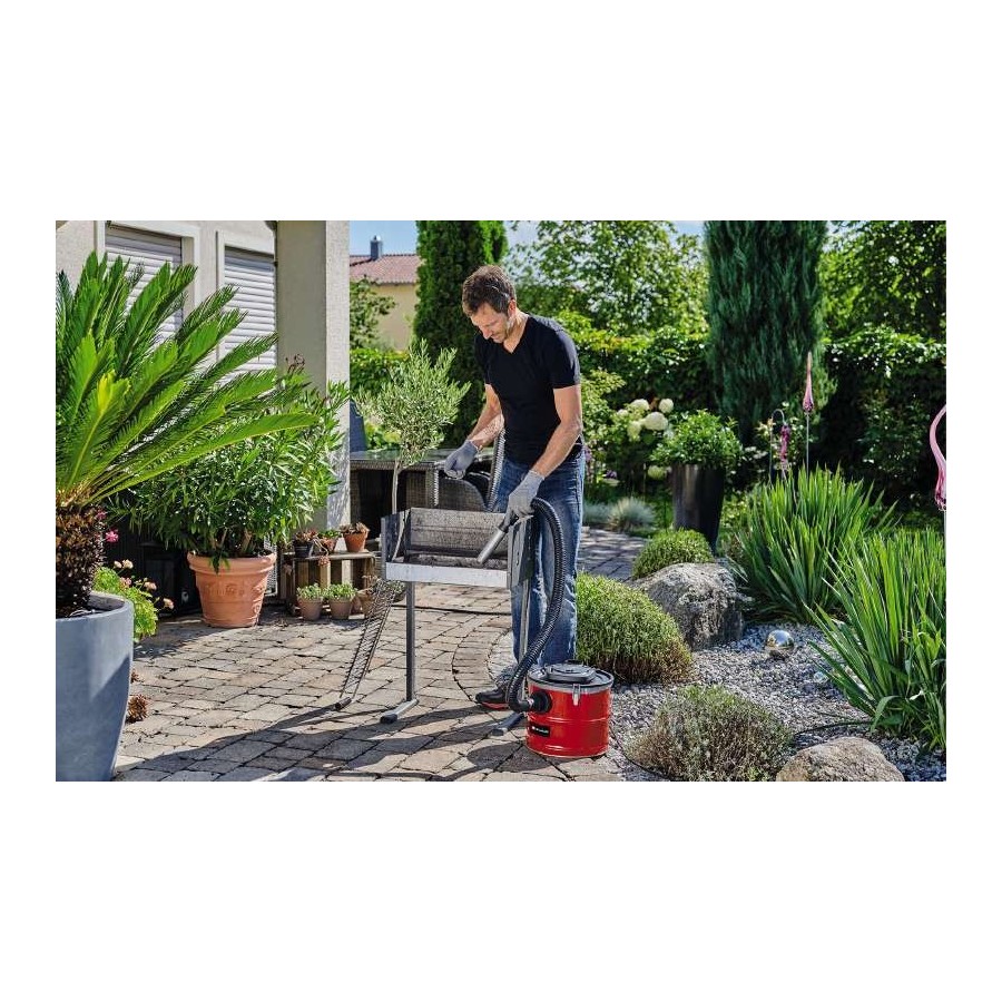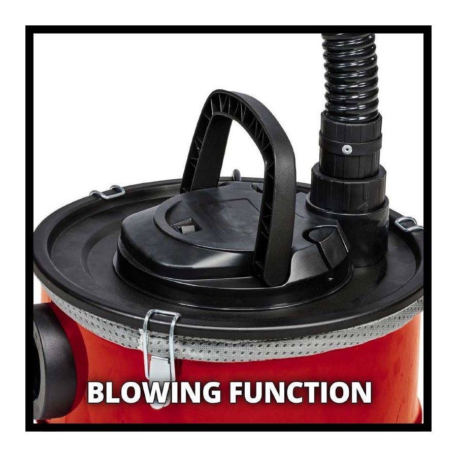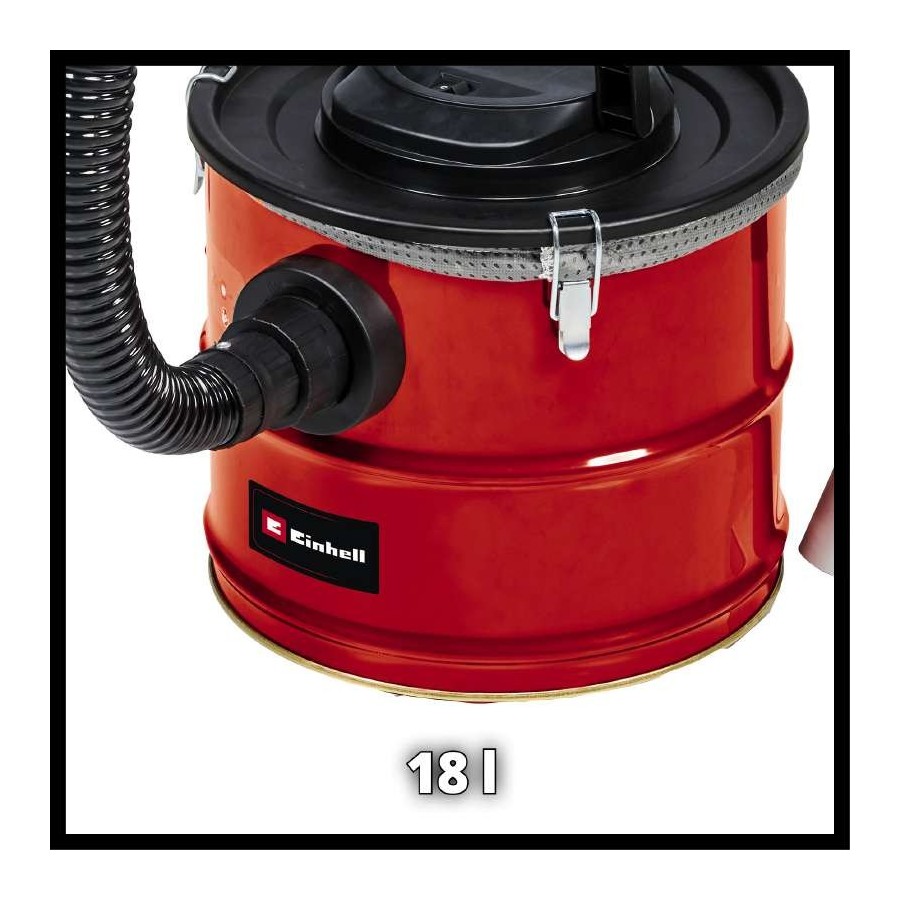Зольний пилосос Einhell TC-AV 1718 DW забезпечує легке та акуратне очищення від золи мангалів, печей та камінів. Максимальна потужність всмоктування становить 170 мбар. Контейнер об'ємом 18 л розрахований на тривалу роботу. Оснащений армованим металом шлангом (36 мм - довжиною 1 м) і алюмінієвою всмоктувальною трубкою. Чистота повітря при зборі золи забезпечується гофрованим фільтром та додатковим попереднім фільтром для кращої фільтрації. Це запобігає швидкому засміченню основного фільтра. Замки зольного пилососу Einhell TC-AV 1718 DW, що швидко відкриваються, дозволяють швидко відкривати контейнер для його очищення. Для зручності роботи та мобільності є ручка для перенесення. Коли кабель живлення не використовується, його можна змотати та закріпити за допомогою застібки з липучкою для зручного зберігання. Існує можливість використовувати функцію видування, під'єднавши шланг до адаптера повітродува, можете очистити доріжки в саду від сторонніх предметів, здувши їх убік.