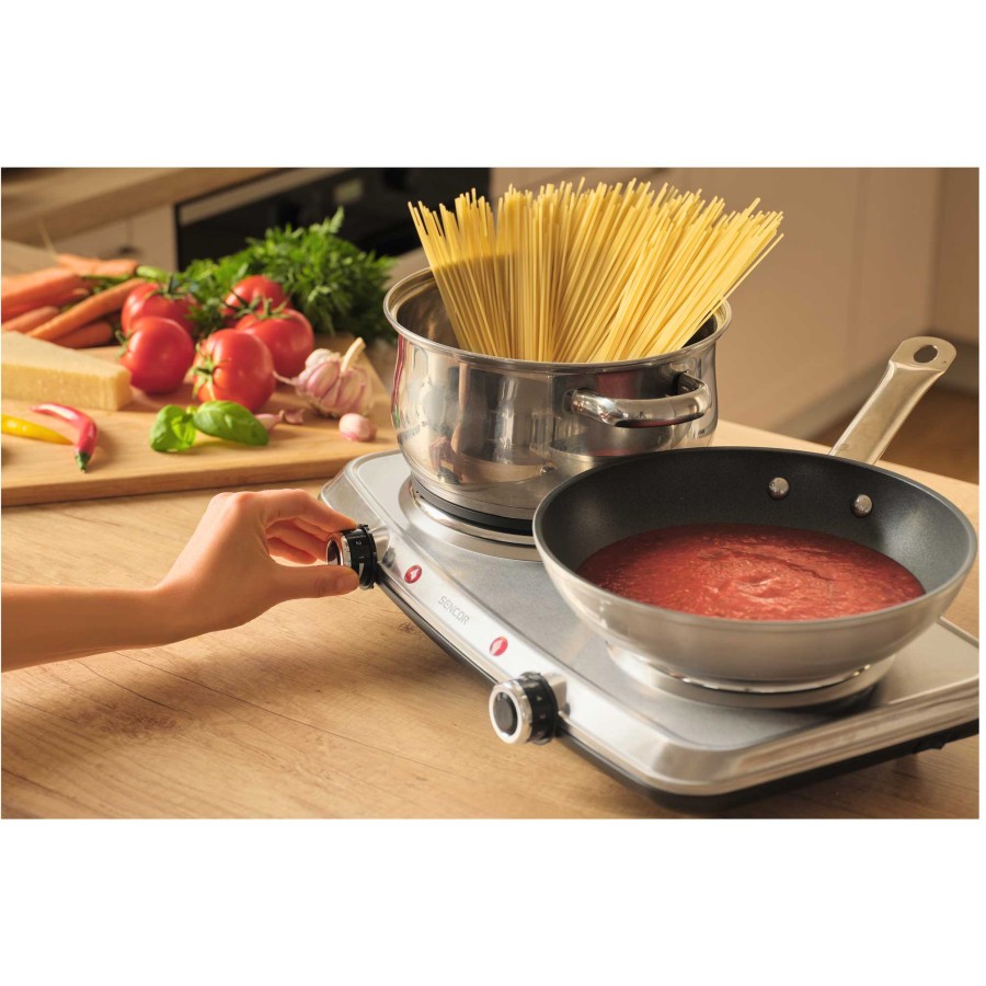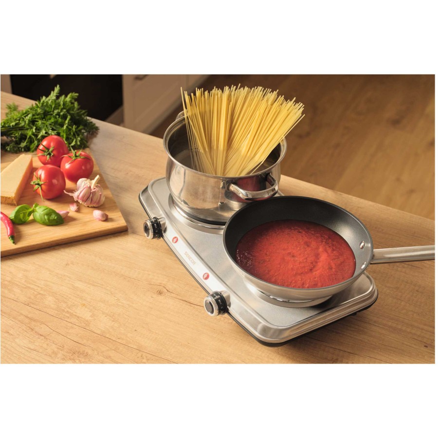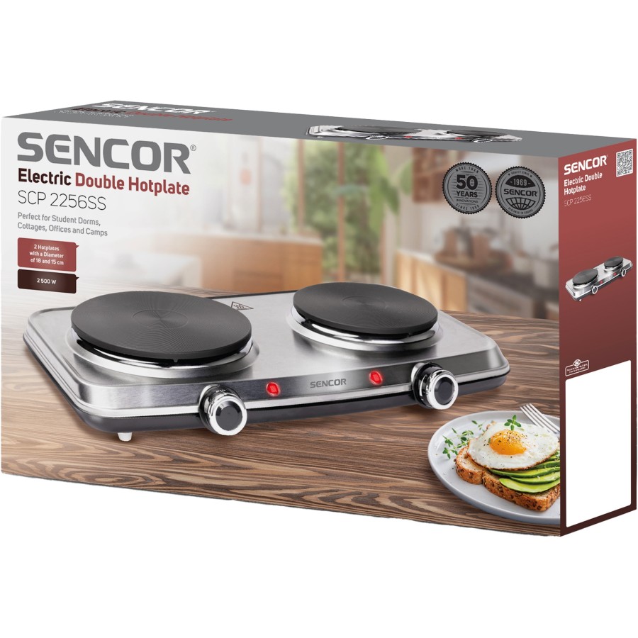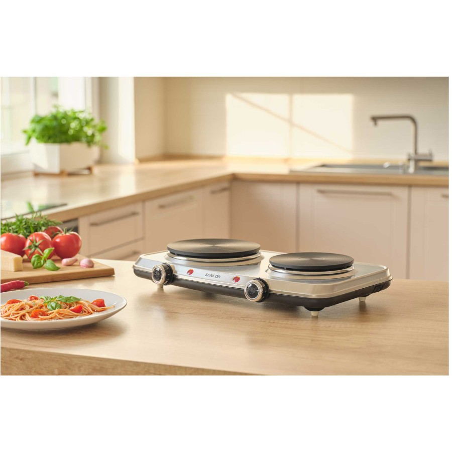 Настільна електроплита Sencor SCP2256SS — це зручне та ефективне рішення для приготування їжі в умовах обмеженого простору або як додатковий нагрівальний пристрій. Вона оснащена двома конфорками діаметром 18 і 15 см, що дозволяє одночасно готувати кілька страв, економлячи час і підвищуючи зручність. Плита має сумарну потужність 2500 Вт, забезпечуючи швидке нагрівання, а термостат із плавним регулюванням температури для кожної конфорки дозволяє точно контролювати процес приготування. Корпус виконаний із нержавіючої сталі сріблястого кольору, яка не лише додає виробу естетичного вигляду, але й легко очищується після використання. Для зручності та безпеки користування передбачено захист від перегріву, світлові індикатори увімкнення, перемикач ON/OFF та протиковзкі ніжки, що забезпечують стабільність приладу на поверхні. Завдяки компактним розмірам і легкій вазі, електроплиту легко переміщати та зберігати. Модель SCP2256SS ідеально підходить для невеликих кухонь, тимчасового використання або як допоміжний пристрій у побуті.
