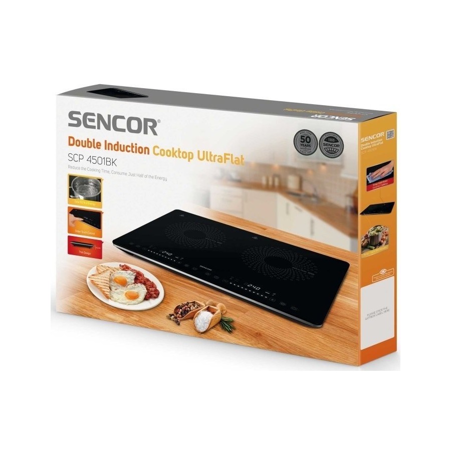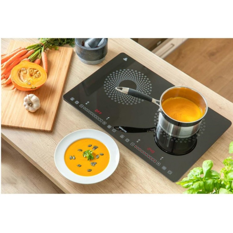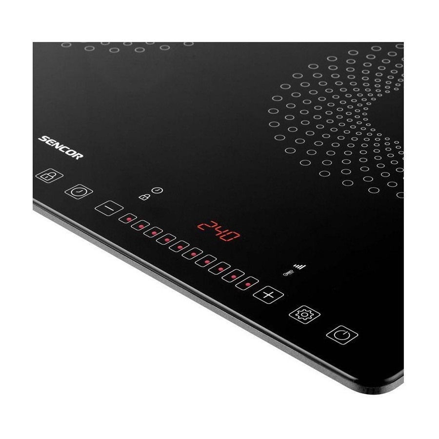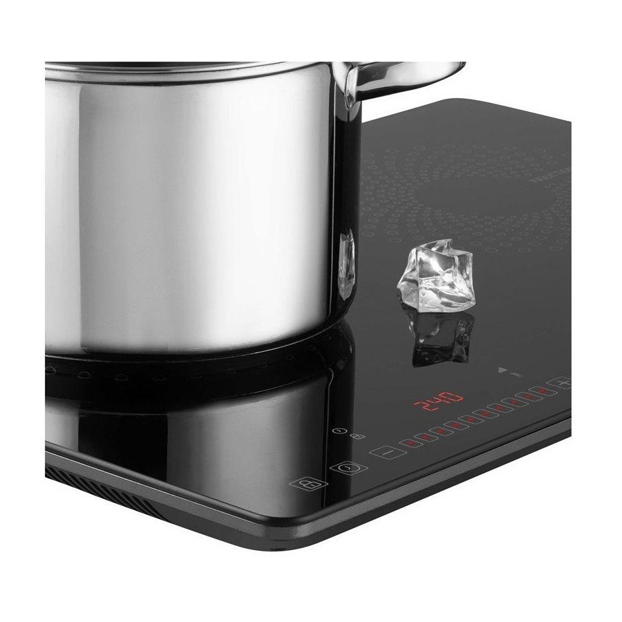 Варильна панель і окремі функції управляються сенсорними кнопками. Температуру і потужність встановлюєте простим рухом пальця вліво і вправо, т.зв. ковзним контактом. Інформацію про температуру і потужності надає великий наочний LCD дисплей з червоним підсвічуванням.