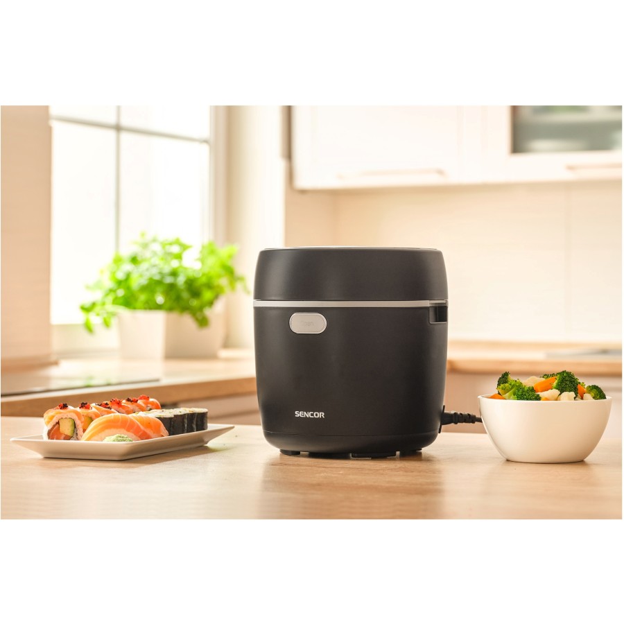 Попри компактні розміри (об’єм 0,6 л), прилад має 8 автоматичних програм приготування: білий рис, коричневий рис, різотто, суші, пиріг, швидке приготування, низьковуглеводний режим і приготування на пару.