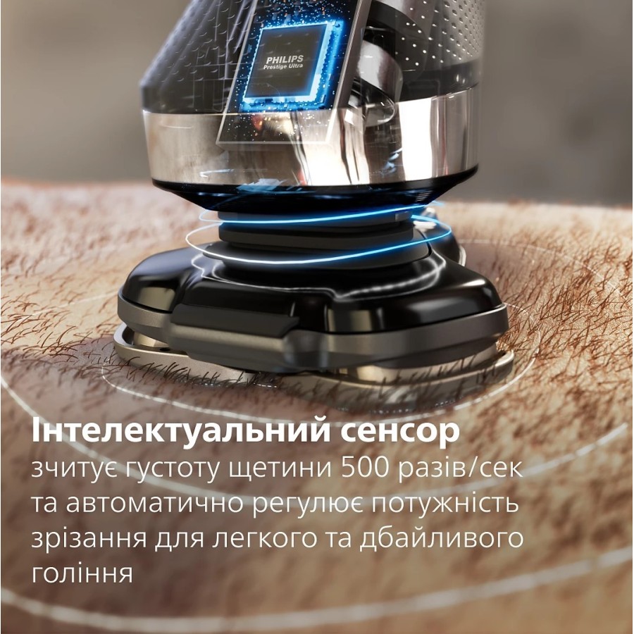 Інтелектуальний сенсор бритви зчитує густоту щетини 500 разів на секунду та автоматично регулює потужність зрізання для легкого й дбайливого гоління навіть щільної щетини.