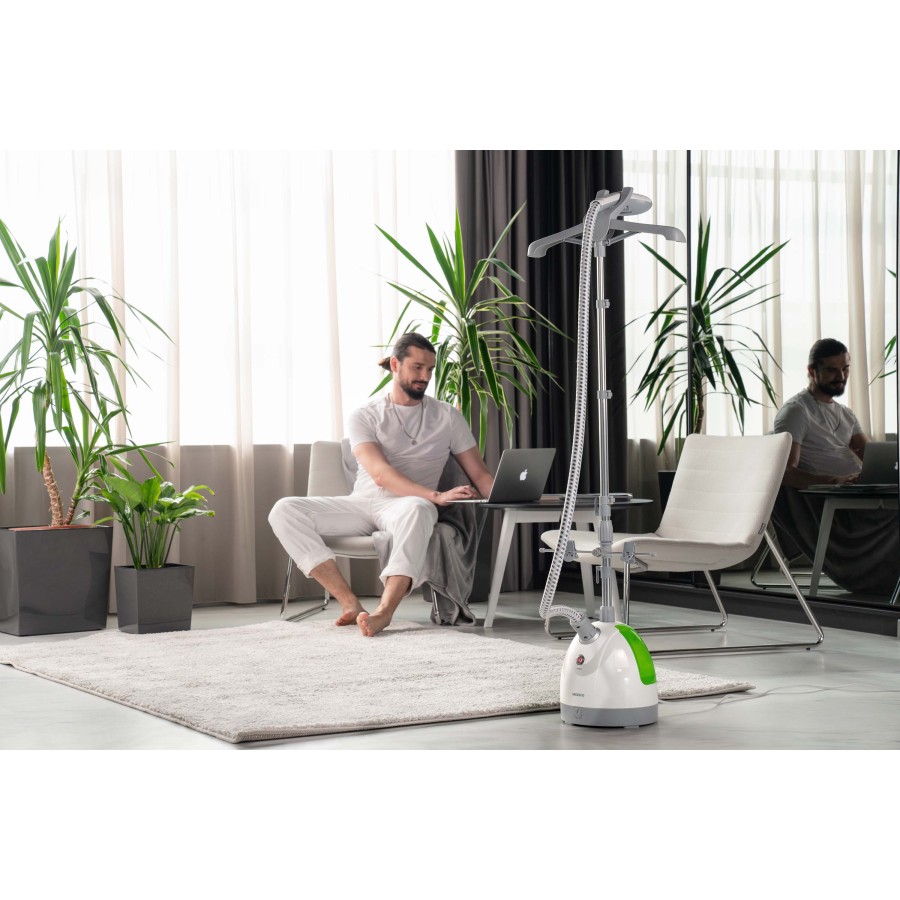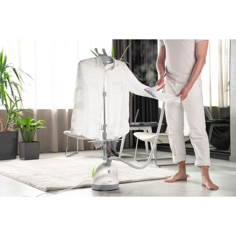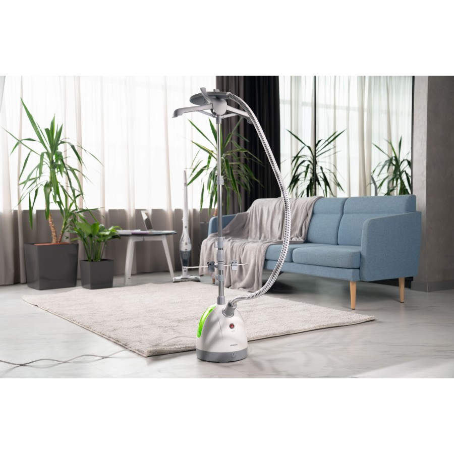 Відпарювач ARDESTO виконаний у елегантному білому кольорі, своєрідний акцент – зеленуватий резервуар для води. Об’єм ємності становить 1 500 мл, тож не потрібно після прасування кожної речі доливати воду – економія часу й зусиль. Потужність моделі складає 1 785 Вт. Постійна подача пари – 30 г/хв. Зручність і свободу рухів забезпечує шланг завдовжки 1,6 м.