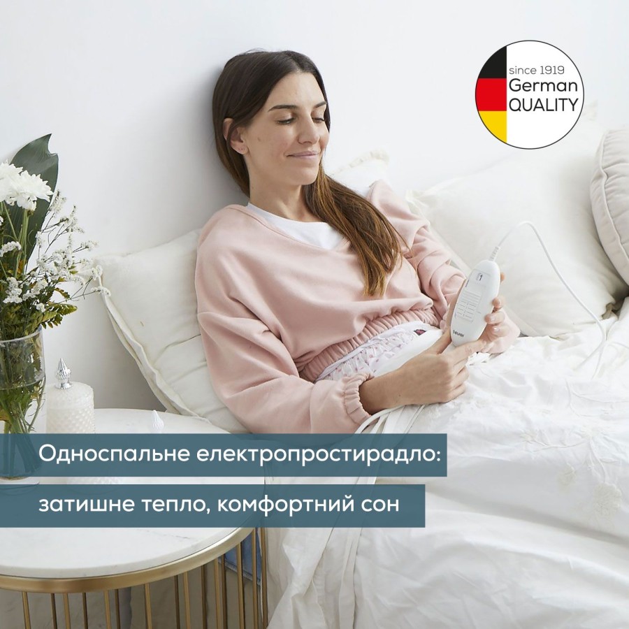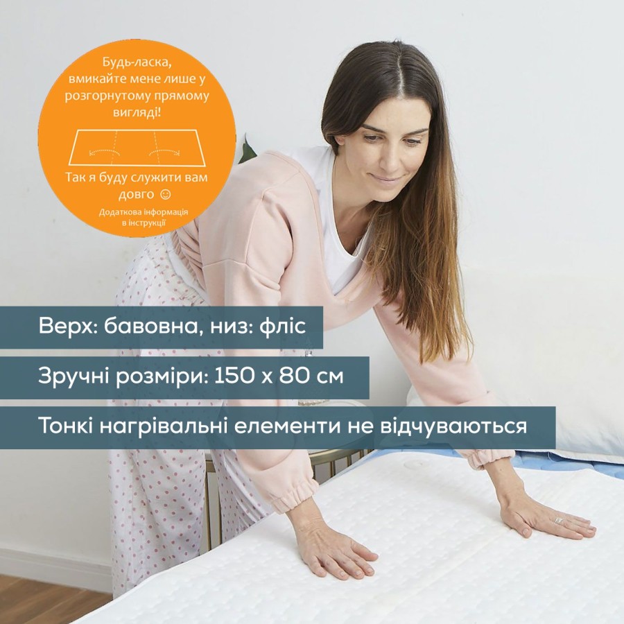 Простирадло з електрообігрівом і квітковим принтом. Односпальний розмір 150х80 см. З легких та дихаючих матеріалів – вгорі бавовна, знизу фліс. Текстиль відповідає якості Öko-Tex Standard 100. Тепле простирадло покращує сон, розслаблює м'язи, зігріває цілу ніч. Перемикач з підсвічуванням, три температурні режими. Система безпеки BSS вимкне прилад у разі несправностей у мережі або інших несправностей. Безперечний плюс - можливість випрати електропростирадло кілька разів за час експлуатації.