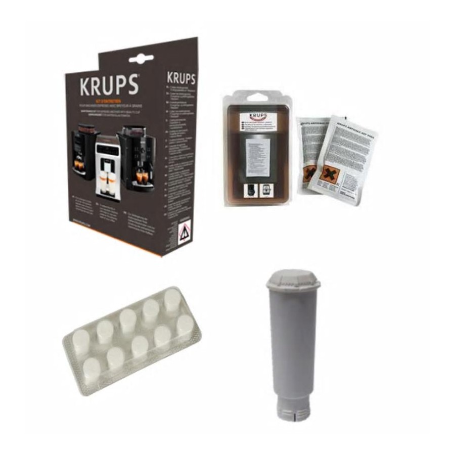 КОМПЛЕКТ ОБСЛУГОВУВАННЯ, в комплект входять: - 2 пакетика кошти для видалення накипу з тестером жорсткості води для усунення відкладень накипу або накипу, які можуть вплинути на смак кофе.- 10 чистячих і знежирювальних таблеток для боротьби із залишками і жирними відкладеннями кави. Меті гарантувати оптимальне збереження ароматів ваших напоїв. (Близько 3 років очистки) .- 1 фільтр-картридж для забезпечення довговічності вашої машини. Видаляє всі сліди хлору і вапняку для очищеної води і смачного кофе.Подходіт для EA907D31, EA891810, EA819N10, EA894T10.