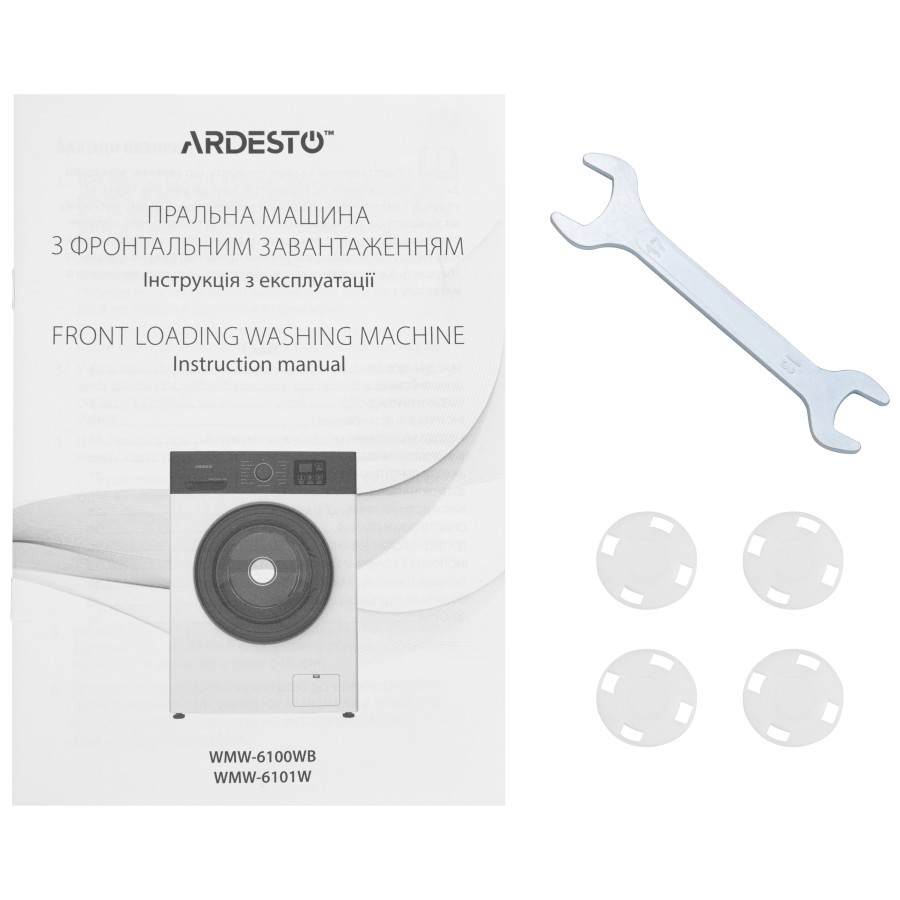 У комплекті з пральною машиною надається інструкція з експлуатації з гарантійним талоном, енергетична етикетка, мікрофіша, шланг подавання води, гайковий ключ і захисні кришки болтів для транспортування. Фактичний розмір ARDESTO WMW-6101W становить 598 × 445 × 845 мм за ваги 47 кг.