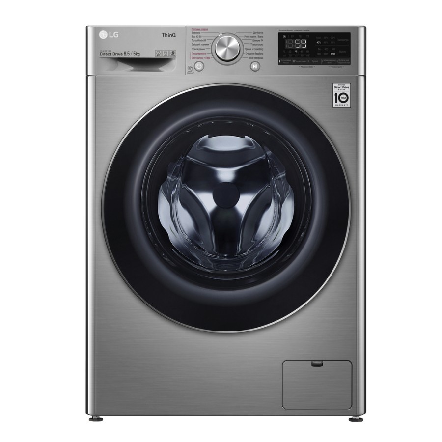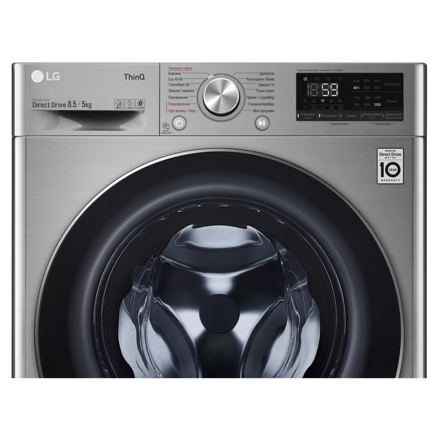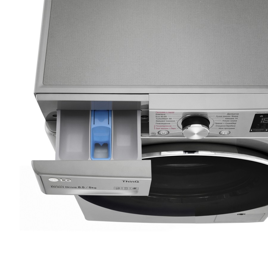 Пральна машина LG F2V5GG9T з можливістю завантаження 8,5 кг для прання та 5 кг для сушіння. Пральна машина оснащена технологією визначення властивостей тканини AI DD™, функцією швидкого прання TurboWash™, інверторним двигуном з прямим приводом Inverter Direct Drive™ та інтелектуальними функціями LG ThinQ™ (Wi-Fi).