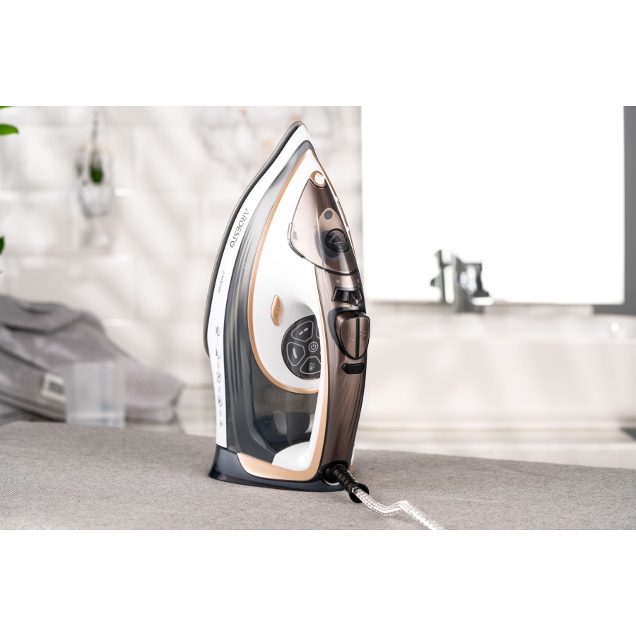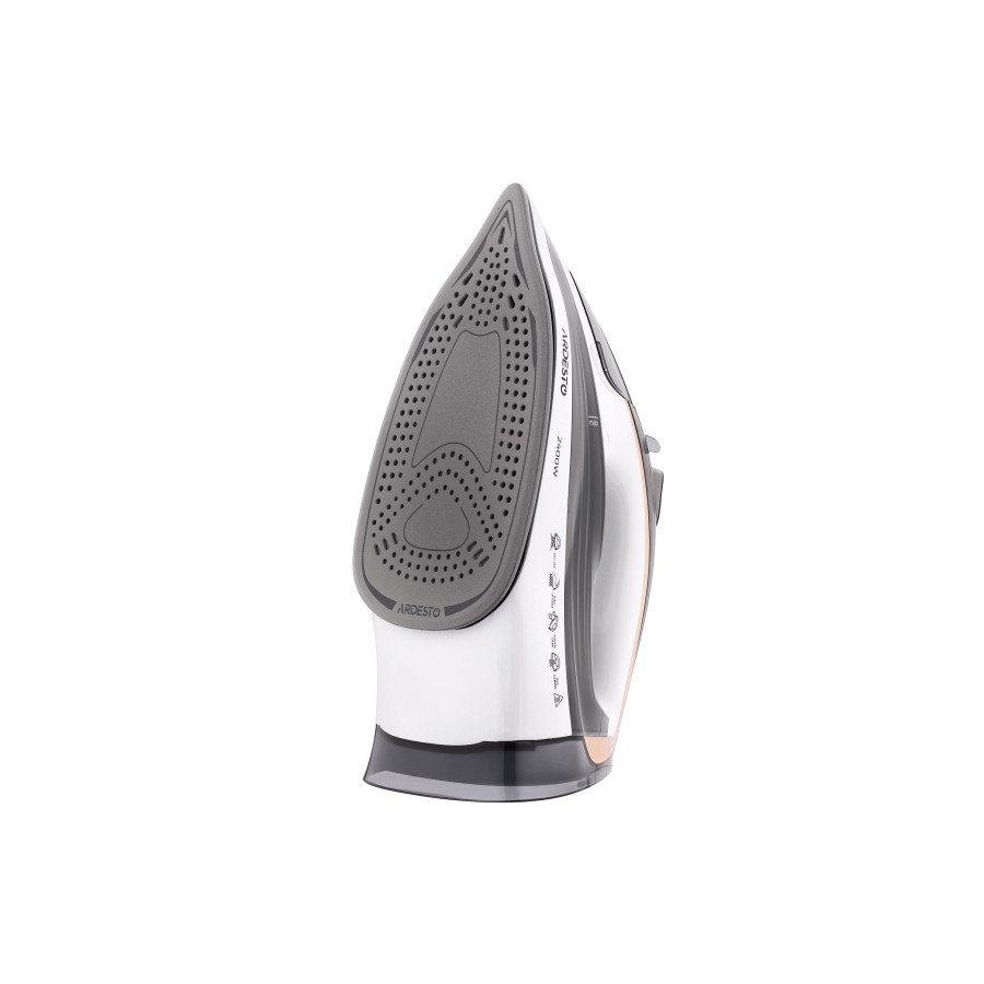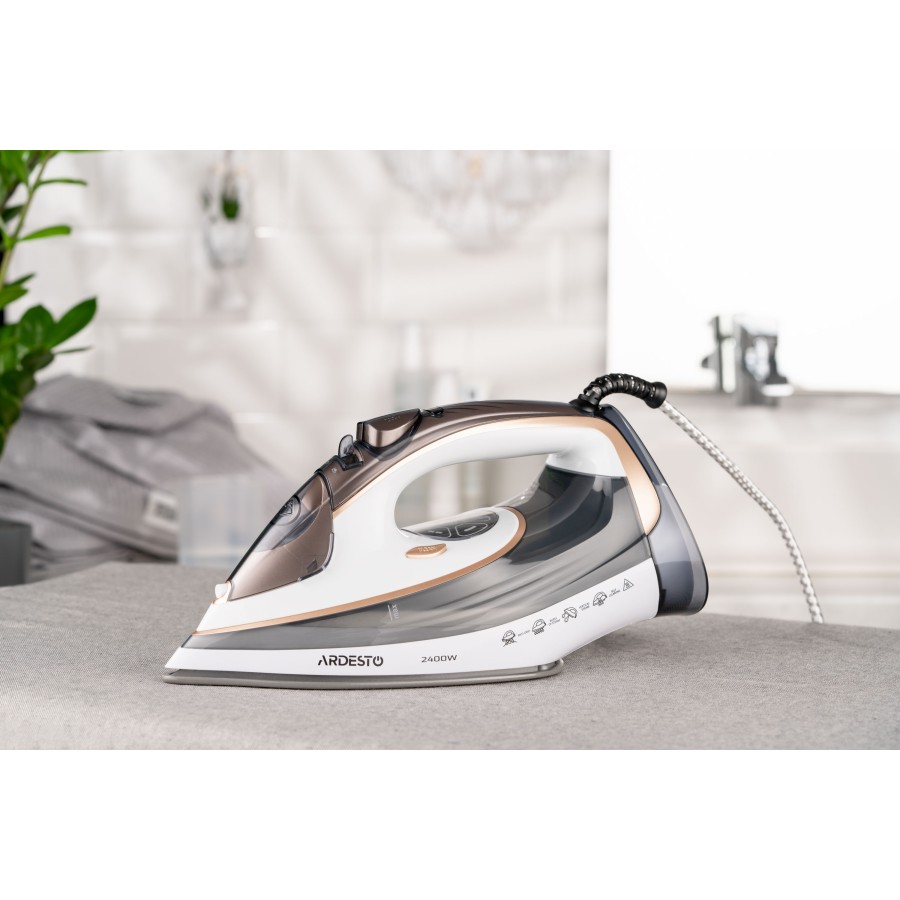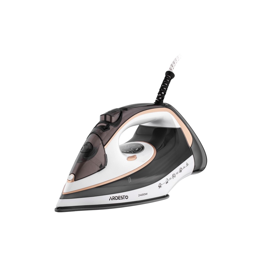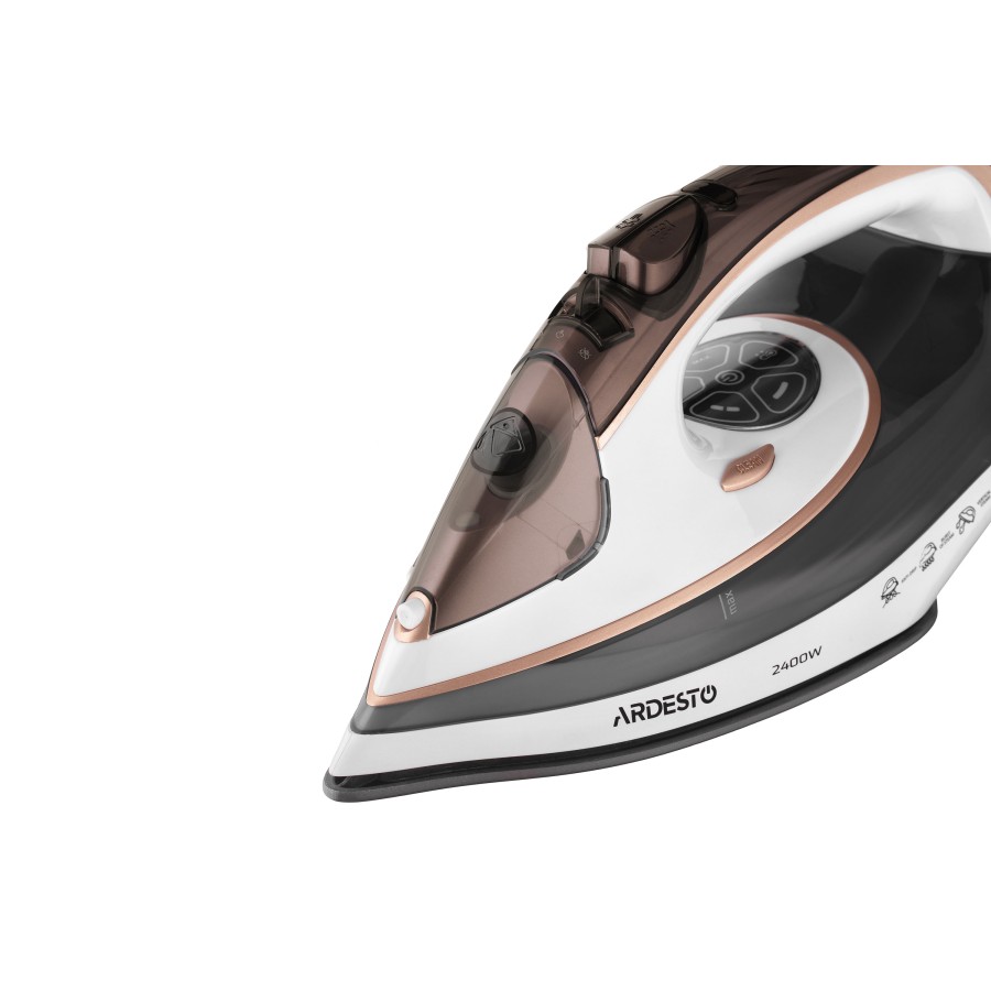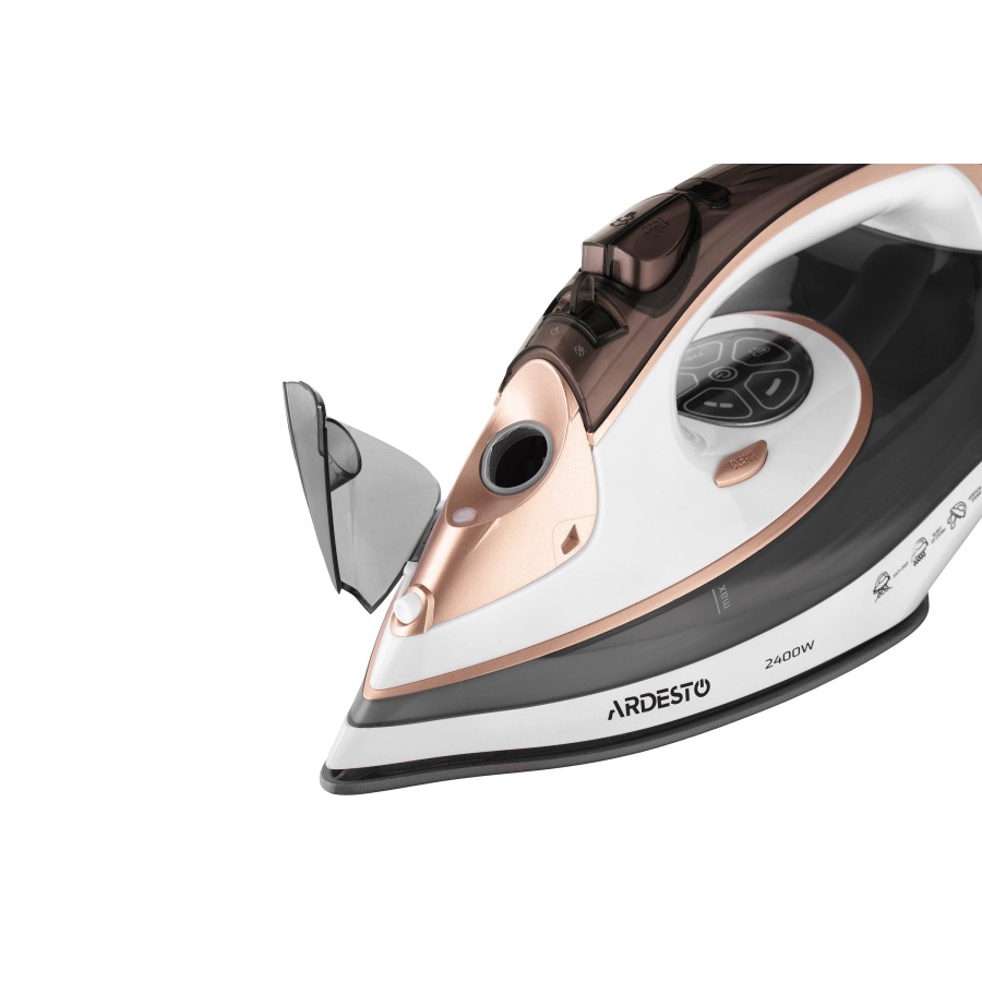Модель IR-B2245-E оснащено збільшеним резервуаром для води об’ємом 400 мл та ергономічною кришкою для максимальної зручності наповнення. Передбачено систему від протікання «протикапля». Стійка до пошкоджень керамічна підошва з 86 перфорованими отворами рівномірно нагрівається та плавно ковзає у будь-якому напрямку. У прасці реалізовано електронний контроль температури та можливість вертикального та горизонтального відпарювання. Завдяки захисту від кальцинації буде збережено високу ефективність відпарювання та надійну роботу праски на довгі роки.