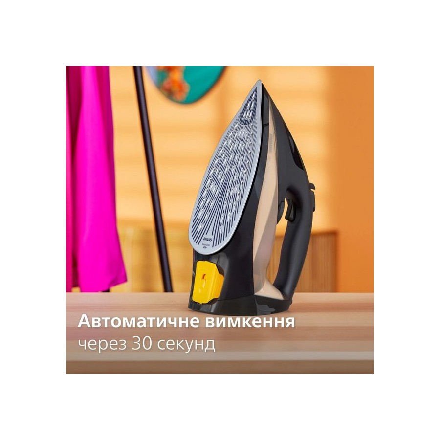 Праска вимкнеться сама, якщо її залишити без руху. У положенні на підошві вона автоматично вимкнеться через 30 секунд, а на п’яті – через 8 хвилин.