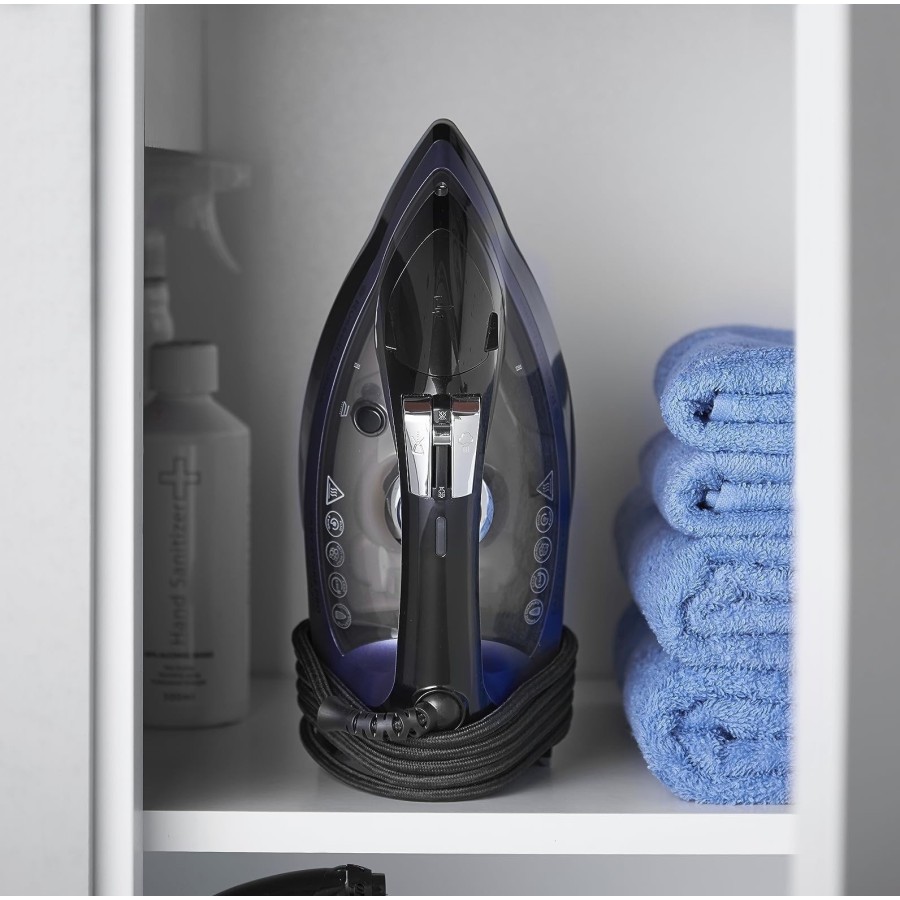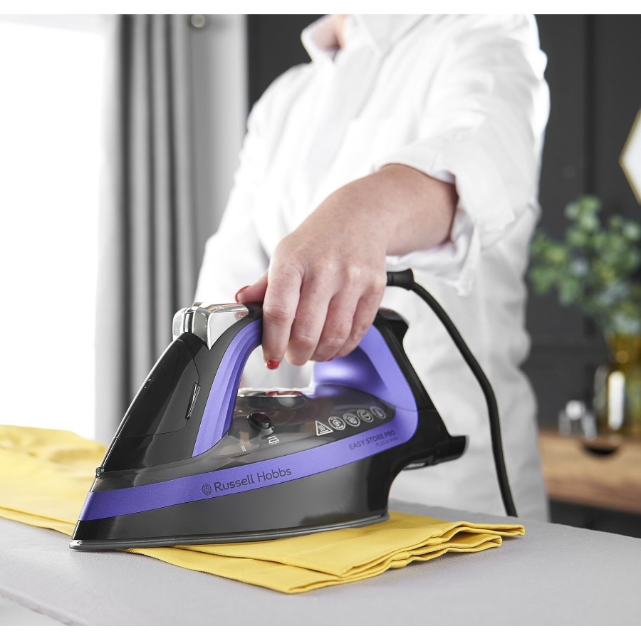 Праска Russell Hobbs Easy Store Pro - це пристрій з потужністю 2400 Вт та резервуаром для води об'ємом 320 мл. Вона може виробляти паровий удар до 200 грам та постійний пар у кількості 50 грам, ідеально підходячи для ефективного гладження складок. Зручна функція зберігання шнура сприяє легкому використанню та зберіганню праски. Завдяки керамічній підошві, вона легко ковзає по тканинах, забезпечуючи плавний рух. Праска має стильний чорно-синій дизайн.