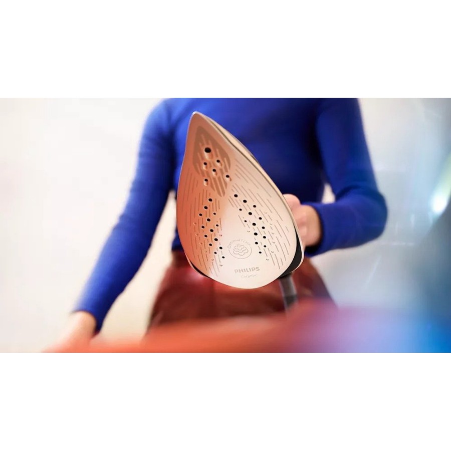Ергономічна головка Iron+, яка вдвічі легша за головку звичайної парової праски, допоможе з комфортом розгладжувати складки на одязі.