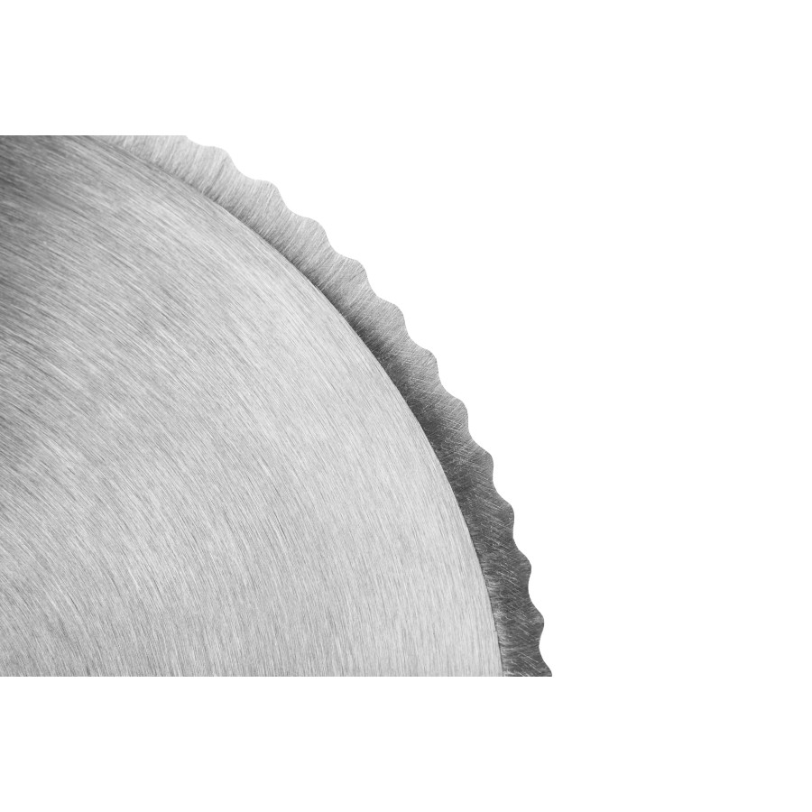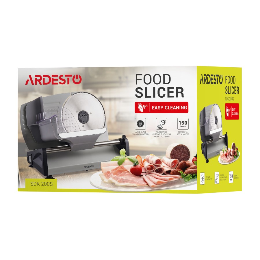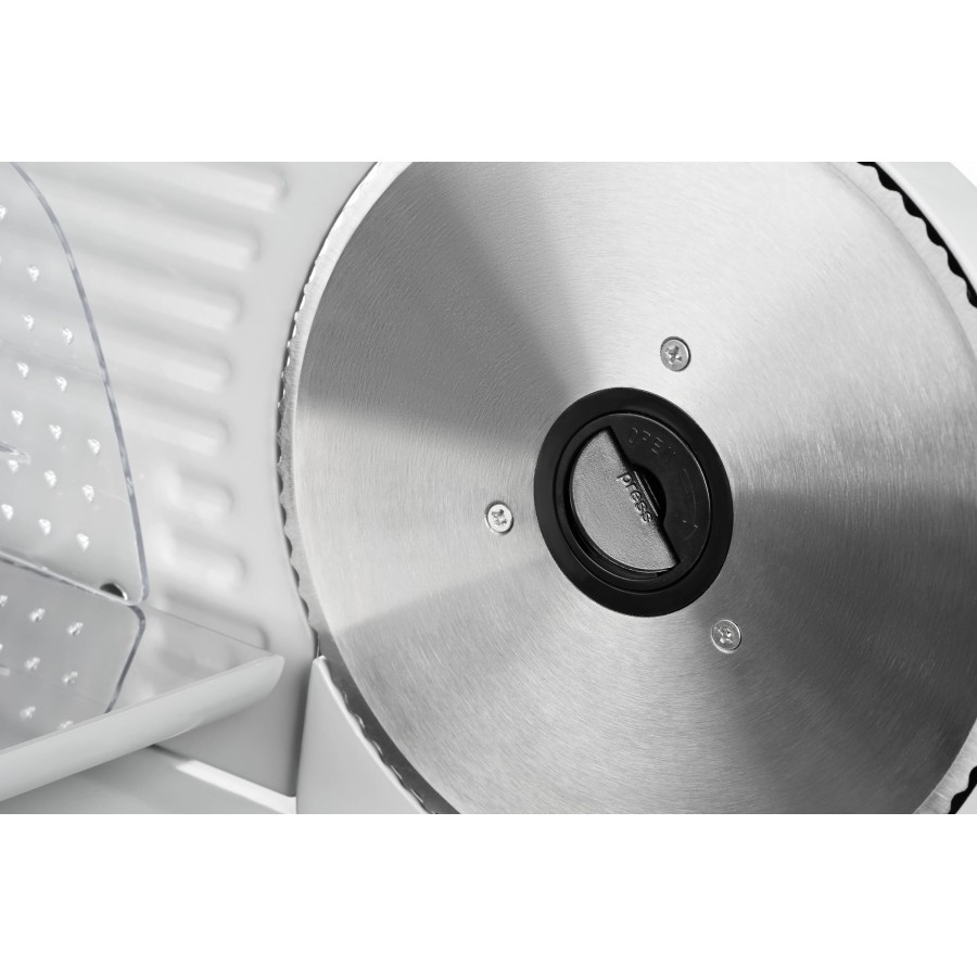 Стальне лезо з діаметром 190 мм отримало серрейторну заточку для більш ефективного нарізання продуктів. Налаштування товщини нарізання від 1 до 15 мм відбувається за допомогою зручного важеля з позначками. Для безпечного користування, клавіша увімкнення доповнена запобіжником. Пластиковий стіл для продуктів отримав зручне кріплення з нахилом, металеве покриття, а також прижимний тримач із зубцями.
