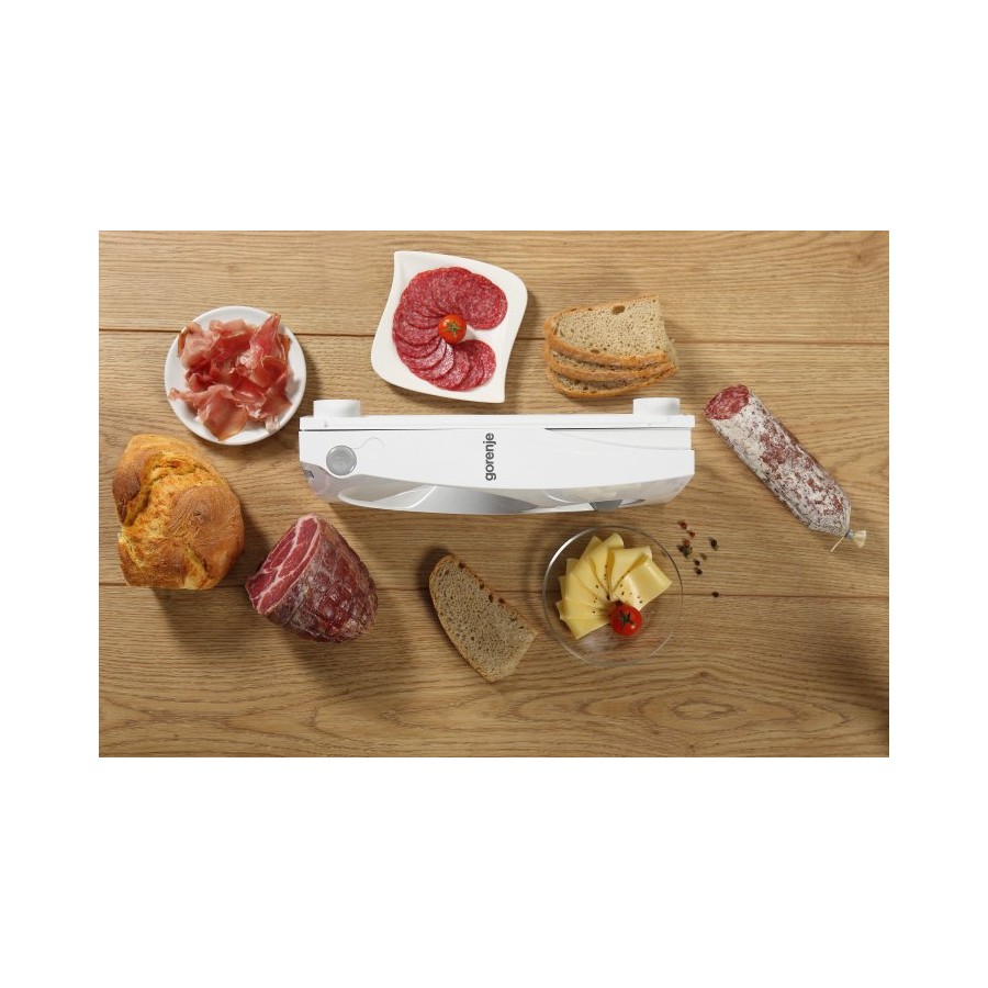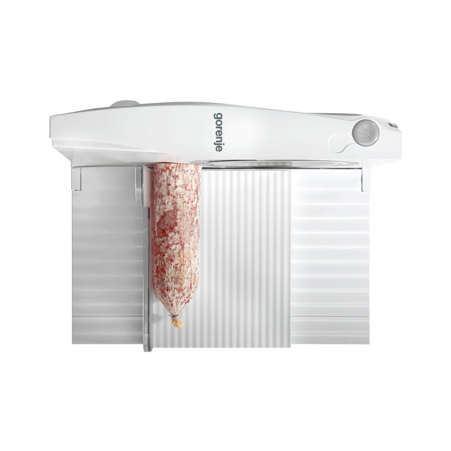 Слайсер оснащено системою безпеки для простого та безпечного нарізання. Щоб працювати з приладом, спочатку використовуйте кнопку безпеки, а потім кнопку ввімкнення. Коли прилад не використовується, поверніть регулятор налаштування товщини до позначки «0», яка є безпечним положенням.