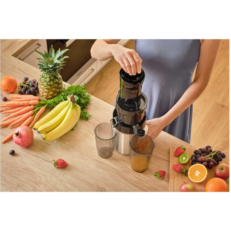 Інноваційна система DripStop запобігає капанню після віджиму, а прозора кришка дозволяє спостерігати за процесом. Фільтруючий мікроочисник із нержавіючої сталі забезпечує відділення м’якоті, дозволяючи отримати до 75% чистого соку. Завдяки двошвидкісному керуванню та реверсу пристрій легко очищується.