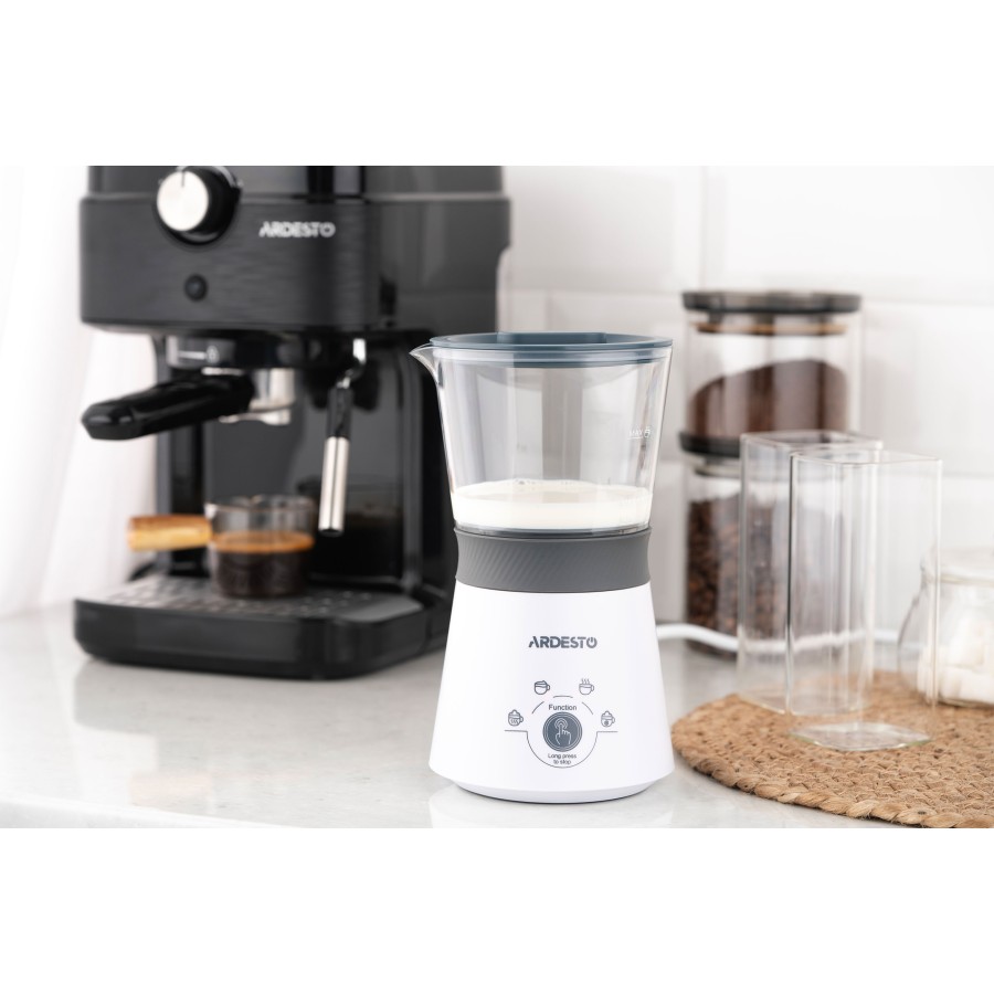 Об’єм чаші становить 330 мл: для підігрівання молока можна наповнити її по самі вінця або до половини (165 мл) для приготування стійкої, пишної піни.