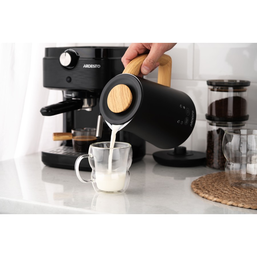 Об’єм резервуара становить 500 мл: для підігрівання молока можна наповнити його по самі вінця або до половини (250 мл) для приготування стійкої, пишної піни. Зручний інтерфейс дає змогу вибрати один із чотирьох режимів: тепла й густа молочна піна, тепла й помірно густа молочна піна, підігрів молока (або іншої рідини) з регулюванням температури, холодна піна. Після закінчення процесу збивання або після певного періоду бездіяльності спінювач автоматично вимикається для економії енергії та безпеки.