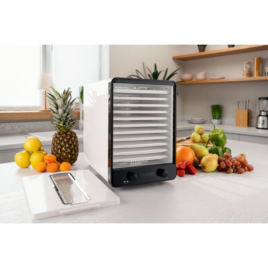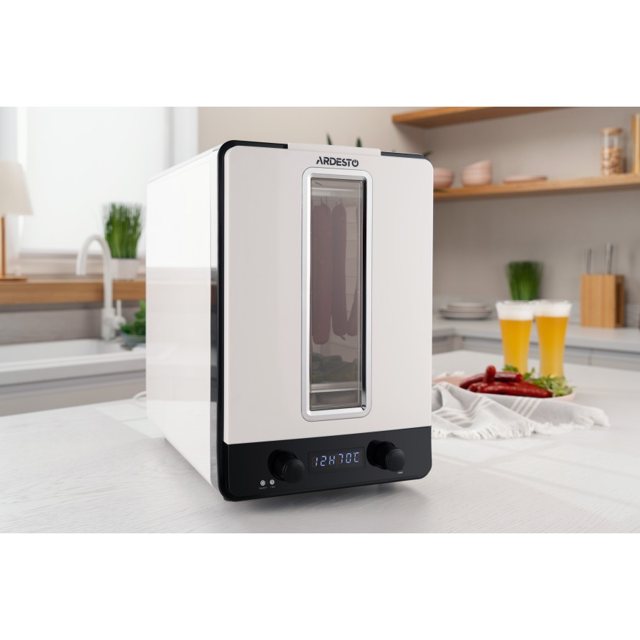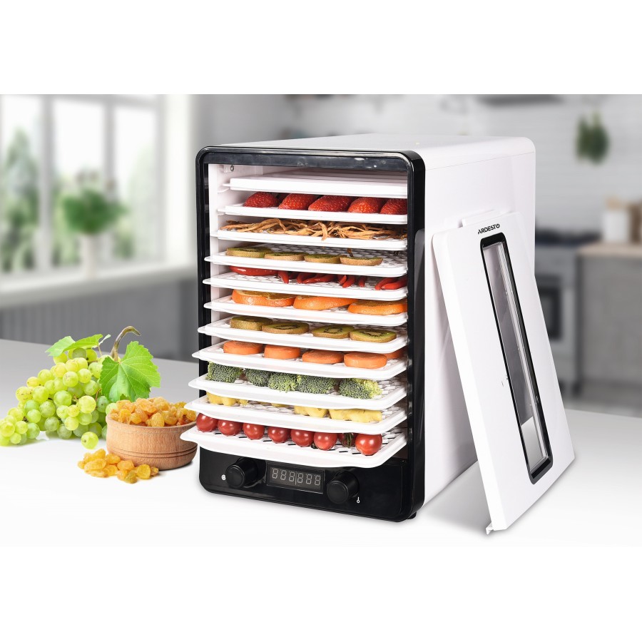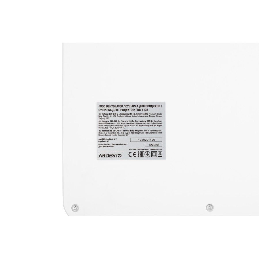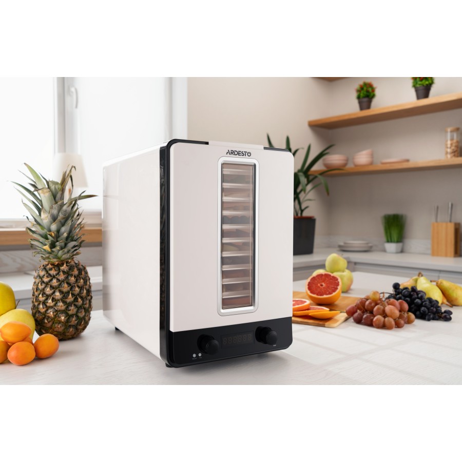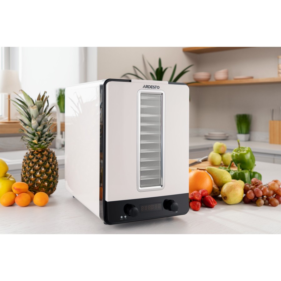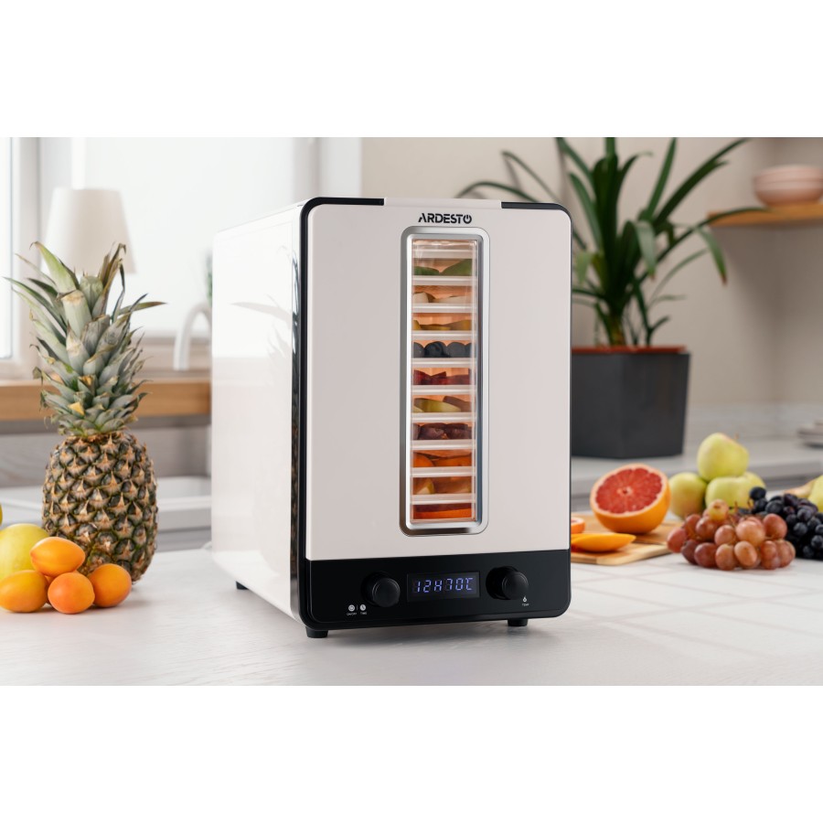 Ardesto FDB-1138 підходить для сушки: фруктів, овочей, грибів, зелені, ягід, м’яса, ковбаси, риби, хліба та інших продуктів. За рахунок температури сушки у межах від 40°С до 70°С, продукти зберігають значну кількість вітамінів та мінералів. Конструкція та розташування піддонів, забезпечують рівномірне висушування на всіх рівнях. Інформацію про температуру та час приготування можна переглянути в інструкції за посиланням (https://ardesto.com.ua/wp-content/uploads/2021/05/Ardesto_FoodDehFDB-1138_A5print.pdf).