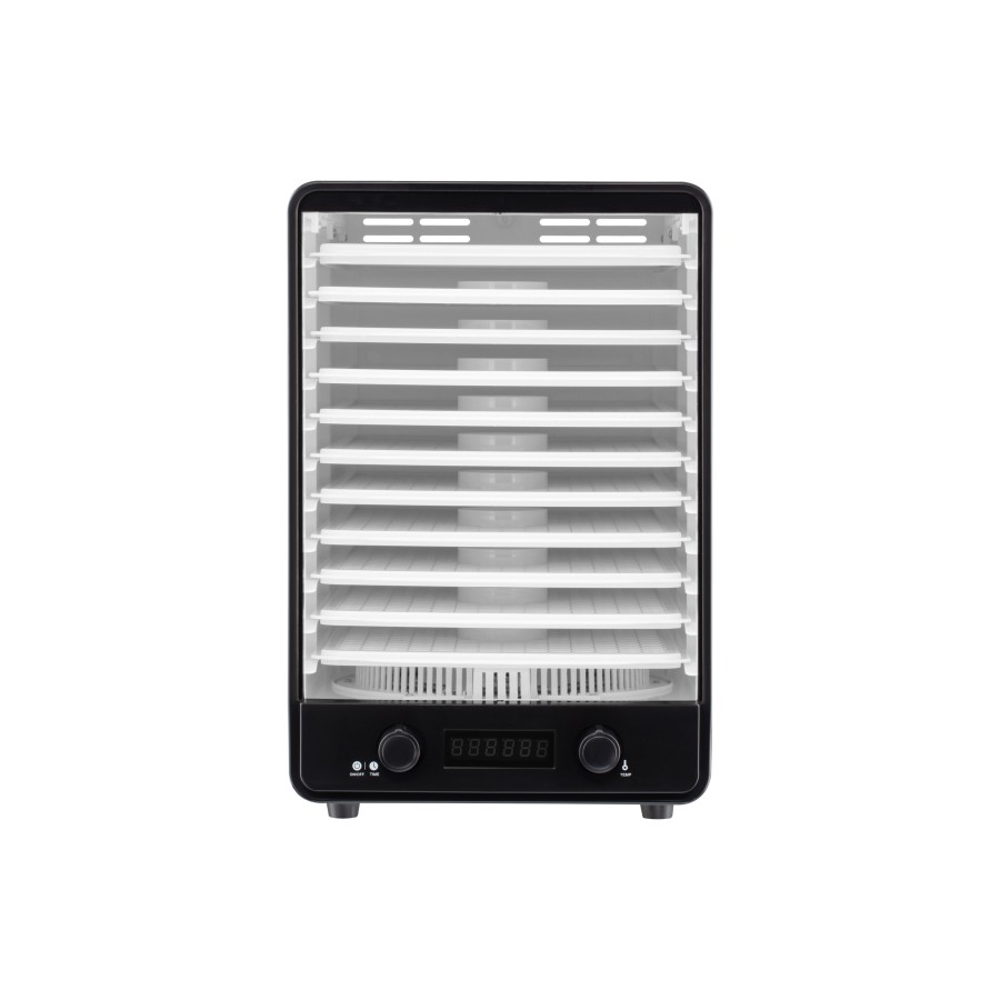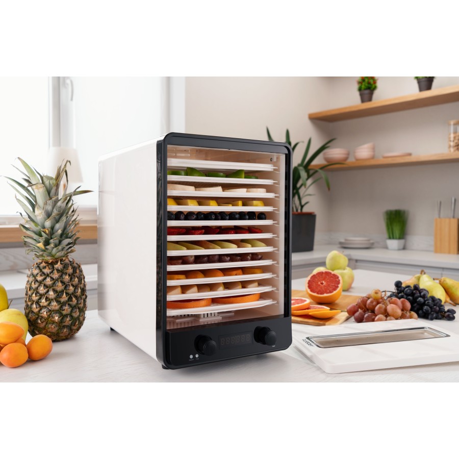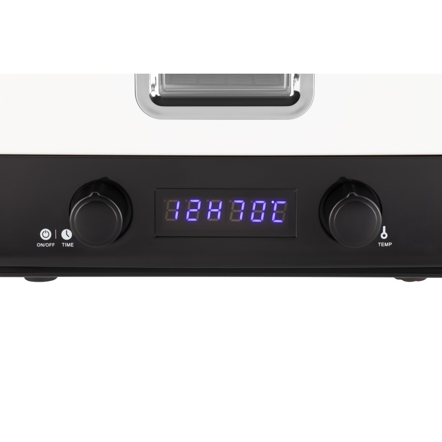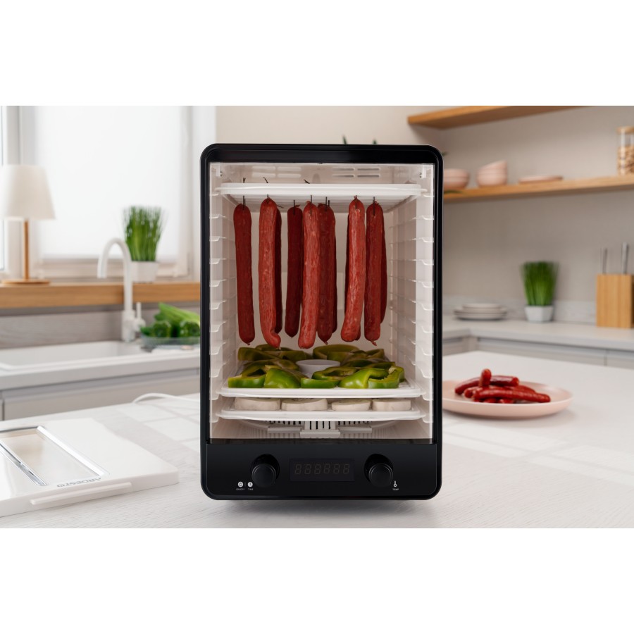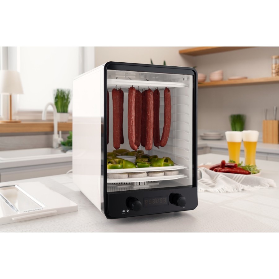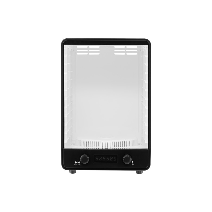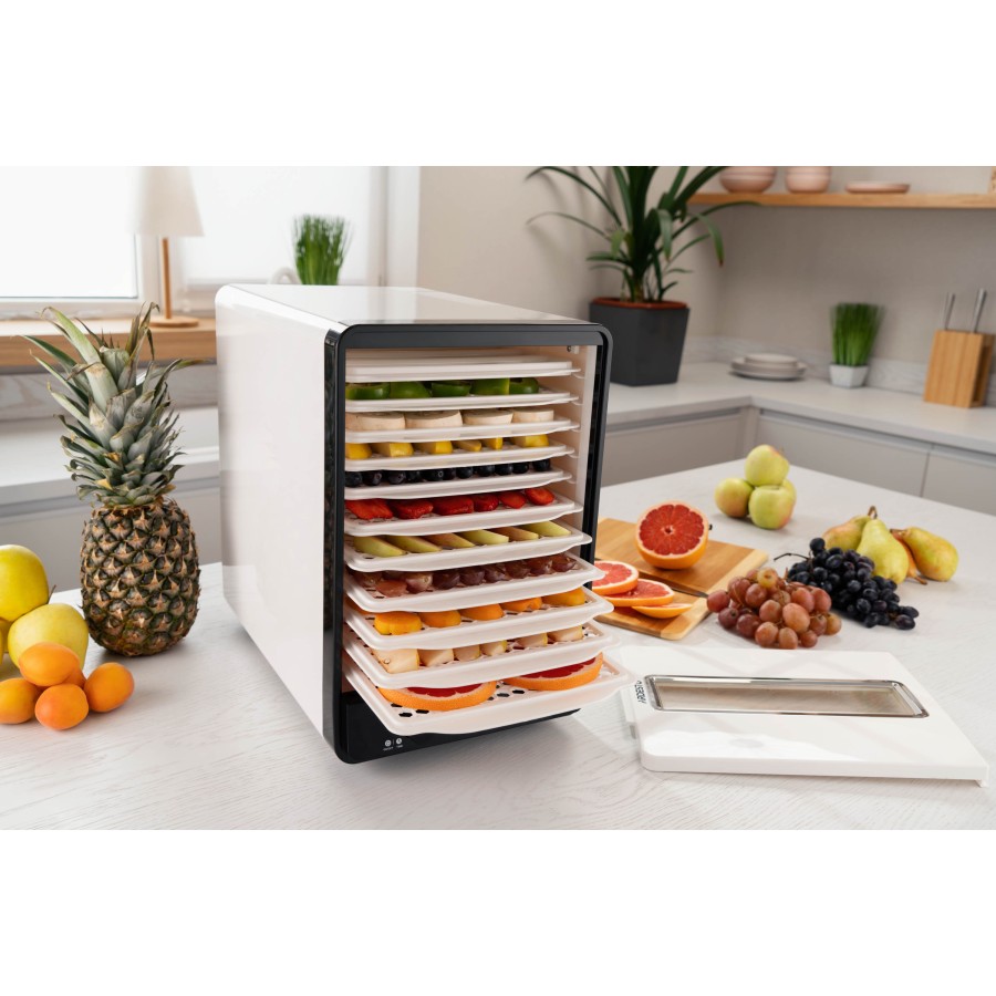 Пристрій складається з основного блоку білого кольору з чорною панеллю та знімними дверцятами. Для контролю за процесом передбачено прозоре віконце та LED-дисплей з відображенням режимів та температури. Пристрій комплектується десятьма піддонами-решітками. Розмір піддонів – 23x29,5x3 см.