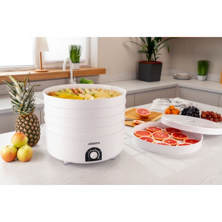 Ardesto FDB-5385 підходить для сушки: фруктів, овочей, зелені, ягід, м’яса, риби, хліба та інших продуктів. За рахунок температури сушки у межах від 35°С до 70°С, продукти зберігають значну кількість вітамінів та мінералів. Інформацію про температуру та час приготування можна переглянути в інструкції за посиланням.