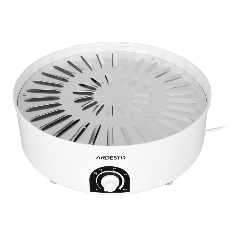 Пристрій у білому кольорі складається з основного блоку, п’яти піддонів-решіток, а також кришки з отвором для повітря. Отвір допоможе слідкувати за станом продуктів. Діаметр піддонів – 38.5 см, а висота кожного складає 4 см. Керування – механічне, є клавіша увімкнення та важіль регулювання потужності.