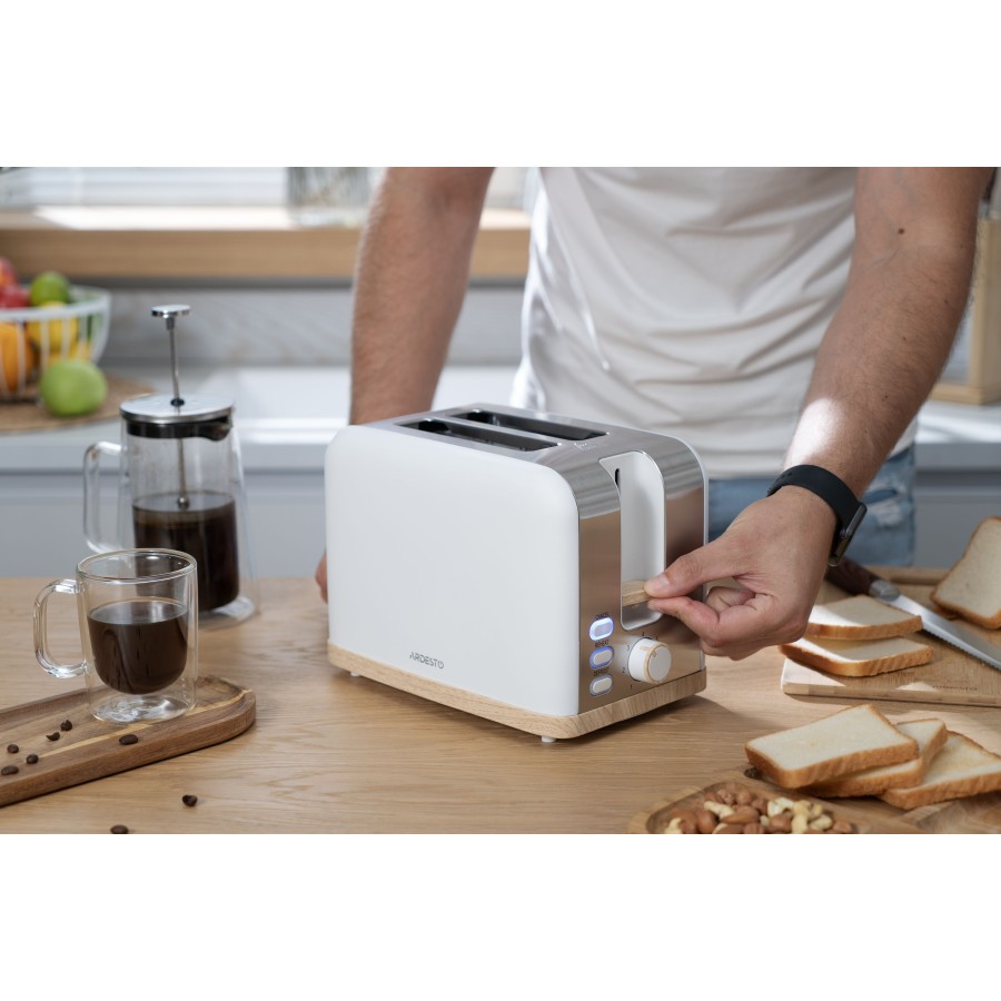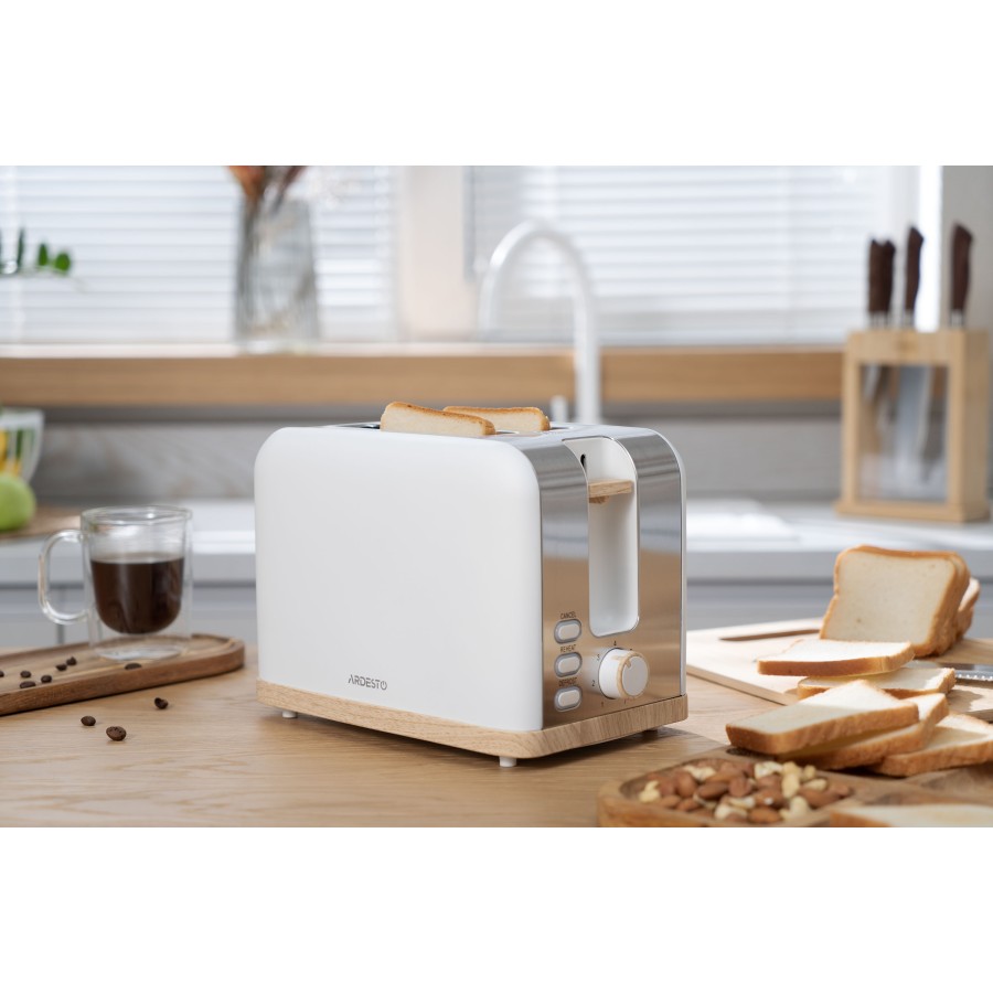 Модель також оснащено функцією автоматичного подавання тостів і захистом від застрягання Anti-jam, що робить готування ще безпечнішим. Автовимкнення і можливість миттєвого припинення процесу приготування за допомогою кнопки скасування забезпечують додатковий контроль. Знімний лоток для крихт зумовлює можливість легко підтримувати чистоту тостера, а нековзкі ніжки гарантують стійкість під час використання.