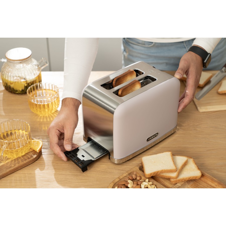 Модель також оснащено функцією автоматичного подавання тостів і захистом від застрягання Anti-jam, що робить готування ще безпечнішим. Автовимкнення і можливість миттєвого припинення процесу приготування за допомогою кнопки скасування забезпечують додатковий контроль. Знімний лоток для крихт зумовлює можливість легко підтримувати чистоту тостера, а нековзкі ніжки гарантують стійкість під час використання.
