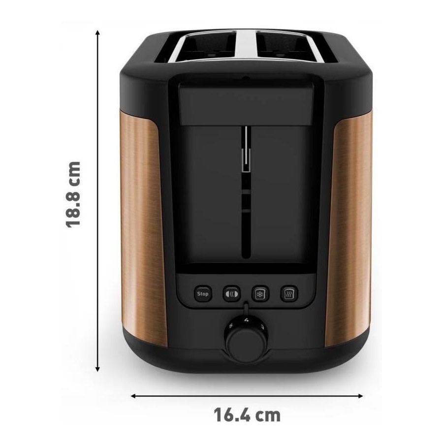 Корпус з нержавіючої сталі в бронзовому кольорі додає елегантності вашій кухні. Компактні розміри (28.2 x 15.7 x 19.3 см) дозволяють зручно розмістити тостер на будь-якій кухонній поверхні. Tefal Coppertinto TT430G10 — це надійний помічник для щоденних сніданків.