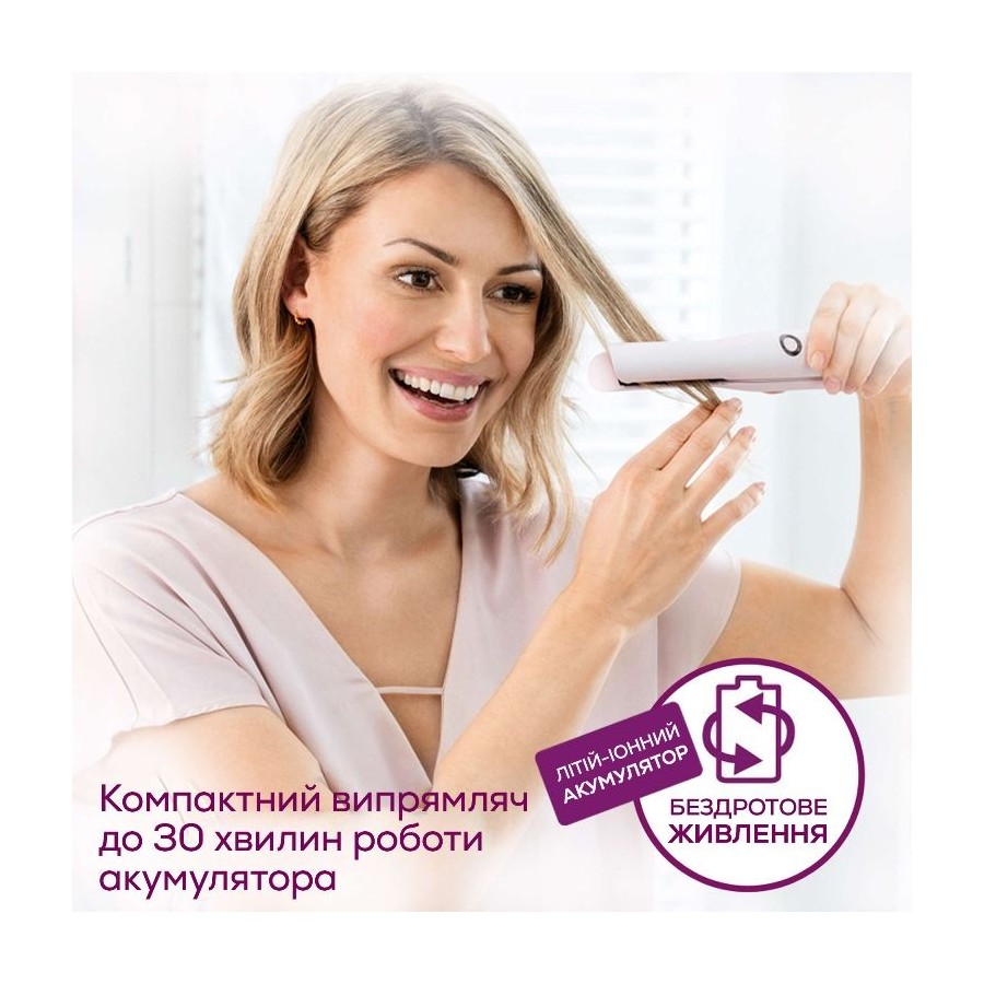 Акумуляторний випрямляч для волосся. Компактний, бездротовий, ідеальний для поїздок. Пластини з турмаліновим і керамічним покриттям дбайливо випрямляють волосся. Три температурних режими та просте управління однією кнопкою.