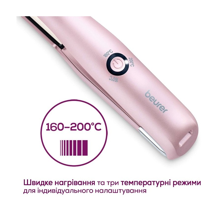 Випрямляч Beurer, безпровідний, mini-USB, 25Вт, темп.режимів-3, >200С, заряд на 20хв, кераміка, турмалін, рожевий (HS_20)