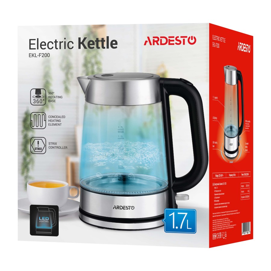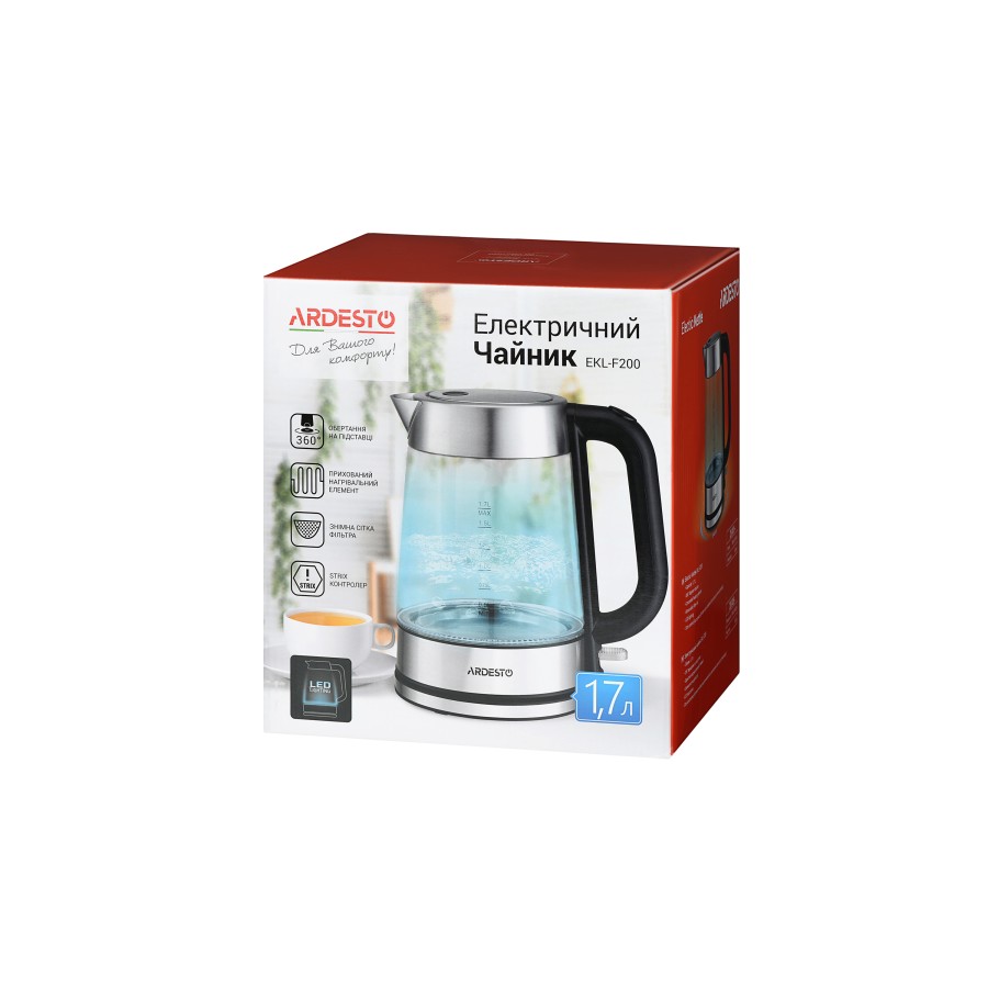 Для комфортного використання є зручна ручка з клавішею відкриття кришки. За включення відповідає окрема клавіша, розташована в нижній частині чайника. Довжина дроту підставки складає 80 см. Робота чайника супроводжується LED-підсвіткою синього кольору. Нагрівальний елемент – прихований.