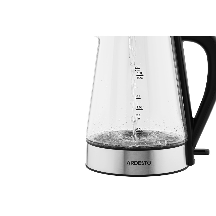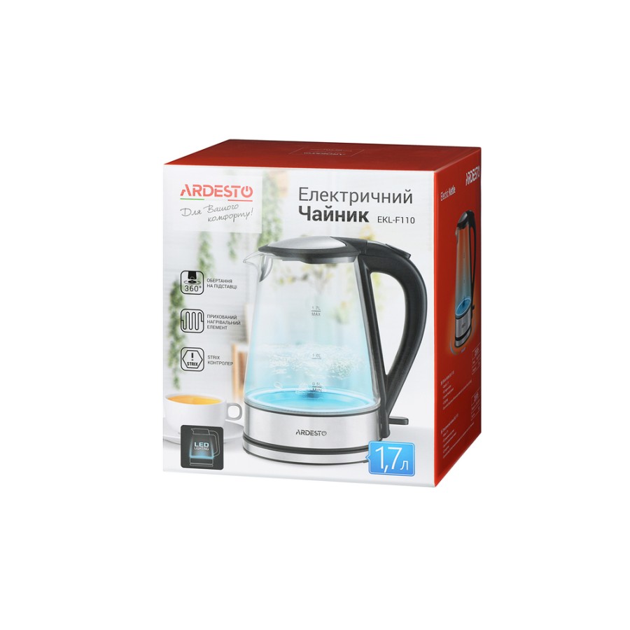 Фільтр накипу легко миється, а для комфортного використання є зручна ручка з клавішею відкриття кришки. За включення відповідає окрема клавіша, розташована в нижній частині чайника. Довжина дроту підставки складає 80 см. Робота чайника супроводжується LED-підсвіткою синього кольору. Нагрівальний елемент – прихований.