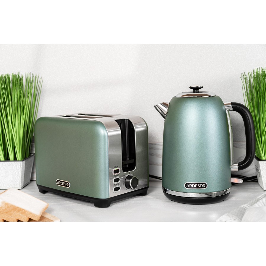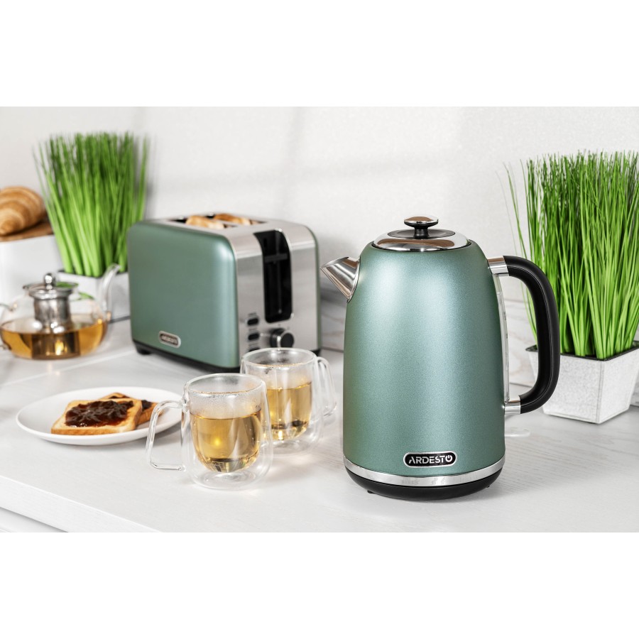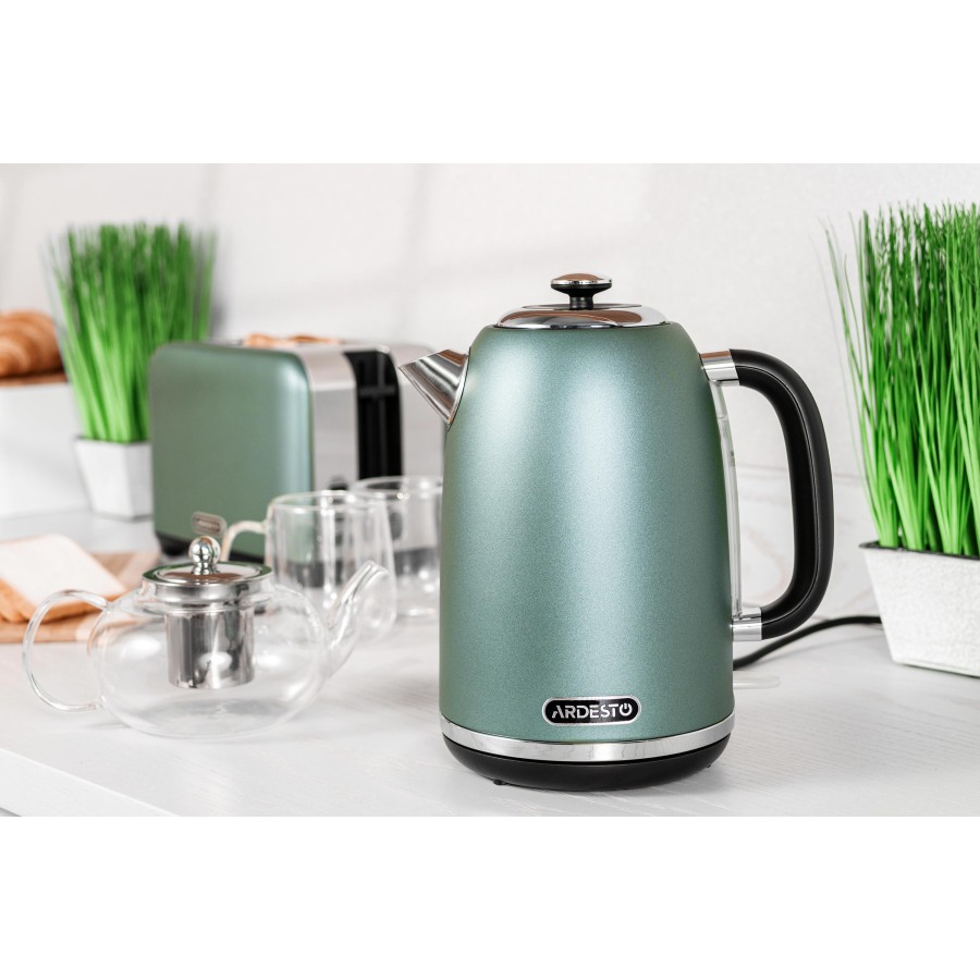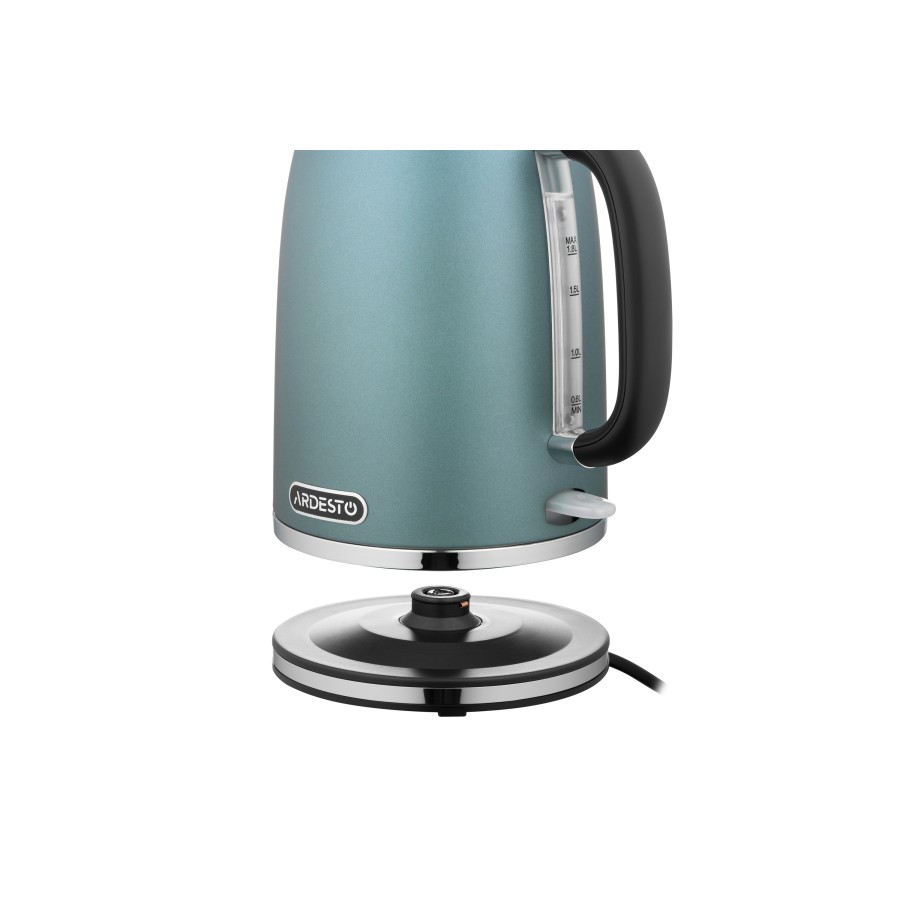Електрочайник ARDESTO EKL-F400G м’ятного кольору є надійним у використанні та має тривалий термін служби. Це забезпечують якісні компоненти: матеріал виготовлення – нержавіюча сталь, прихований нагрівальний елемент і знімний фільтр від накипу. Модель потужна – за показника 2 200 Вт, об’єм 1,8 л дуже швидко й економно нагріє.