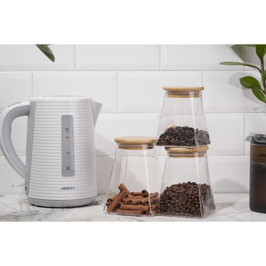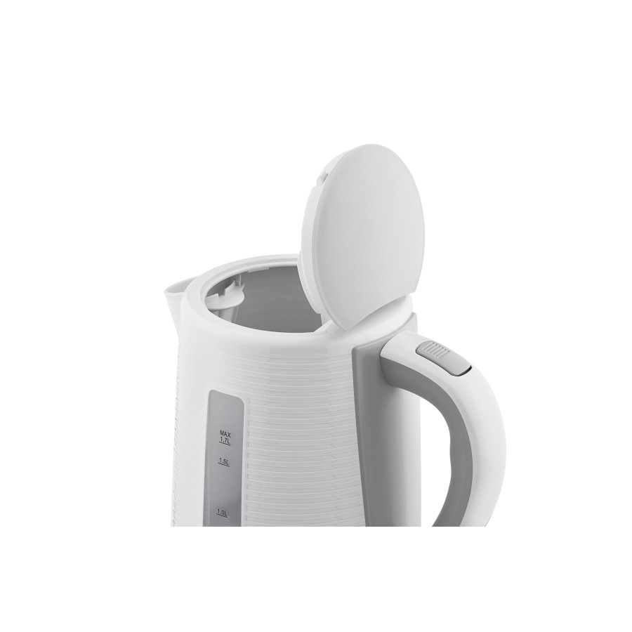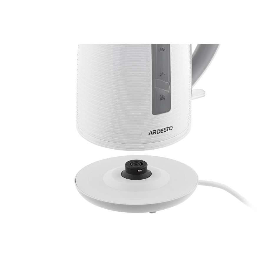 Шкала об’єму має зручні відмітки, а для комфортного використання є ручка з клавішею відкриття кришки. За включення відповідає окрема клавіша, розташована в нижній частині чайника. Довжина дроту підставки складає 80 см. Нагрівальний елемент – прихований.