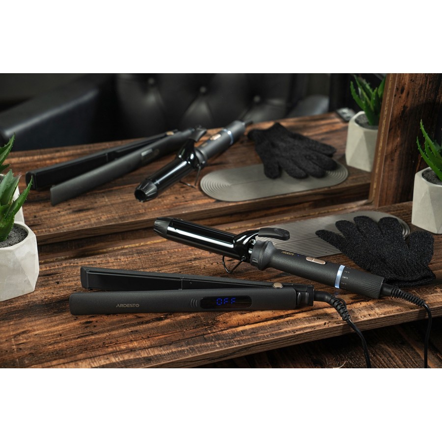 Керамічне покриття мінімізує негативний вплив високої температури на волосся, а також робить користування плойкою максимально безпечним. Також пристрій оснащено функцією автоматичного вимкнення за 60 хвилин. Зручна рукавичка з термостійкого нейлону, що є в комплекті, додатково захистить користувача у випадку небажаного доторку до нагрівального елементу.