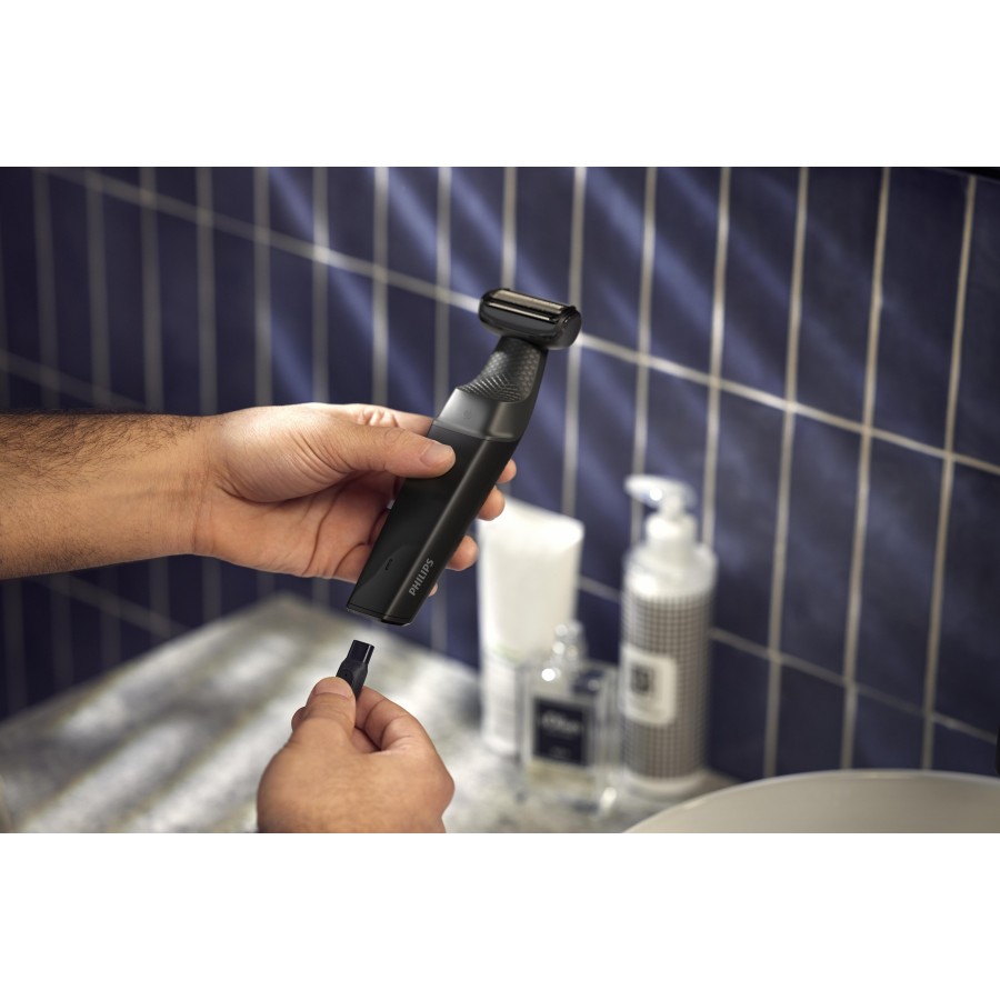 Підстригайте волосся, яке росте в будь-якому напрямку, за допомогою двостороннього тримера та 3-мм гребінця. Для густішого волосся рекомендується попереднє підстригання. Бритовна головка має запатентовані заокруглені наконечники та гіпоалергенну плівку для захисту шкіри від порізів і подряпин під час гоління. Ваш пристрій для вологого й сухого підстригання волосся на тілі є повністю водонепроникним, тому його можна використовувати в душі або поза ним. Для найкращих результатів використовуйте пристрій на сухому волоссі перед прийомом душу. Потужна акумуляторна батарея для обробки всього тіла, 50 хвилин роботи в автономному режимі. Завдяки гумовій ергономічній ручці пристрій для підстригання волосся на тілі легко тримати і переміщати для більш контрольованого підстригання