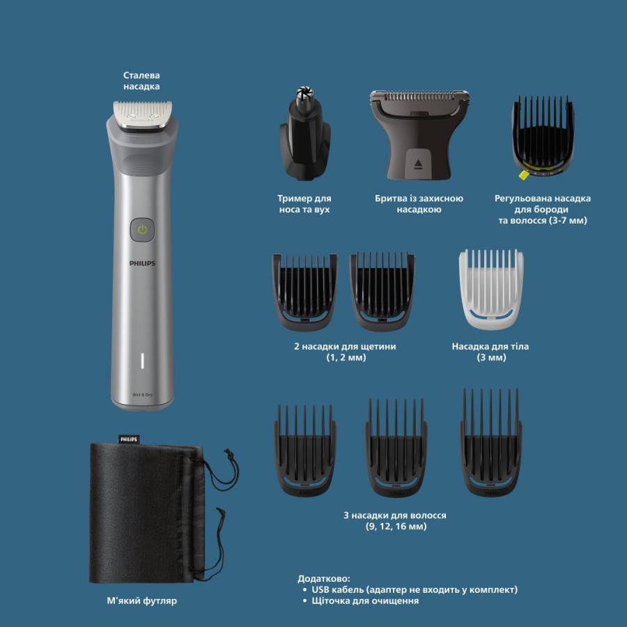 Цей універсальний тример з різними насадками пропонує 11 налаштувань довжини від 0,5 до 16 мм для рівномірного підстригання короткої та довгої бороди.